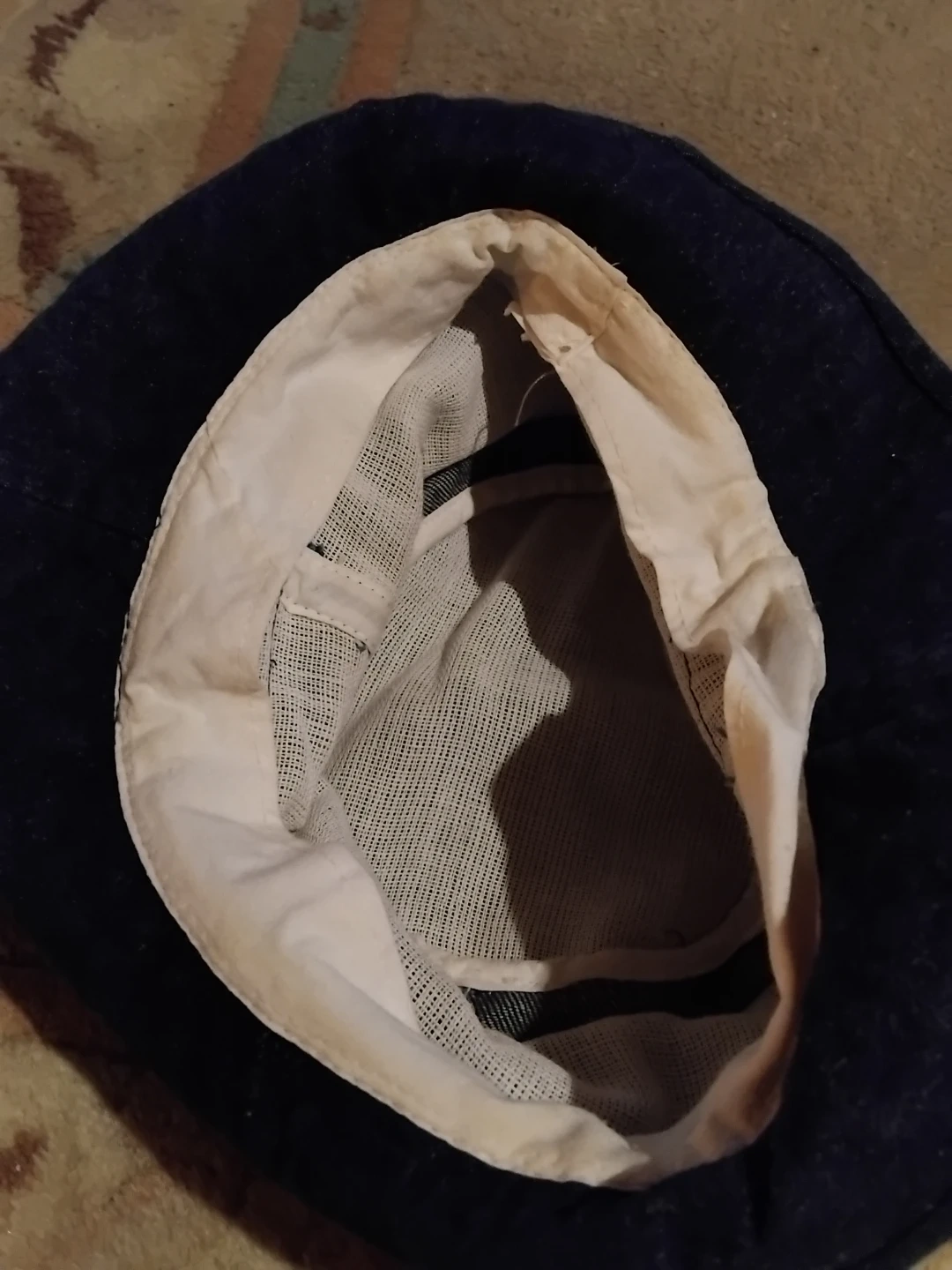 A dark wash denim bucket hat with a comfortable white lining. It's a classic style that offers sun protection. This hat is suitable for casual wear outdoors.
