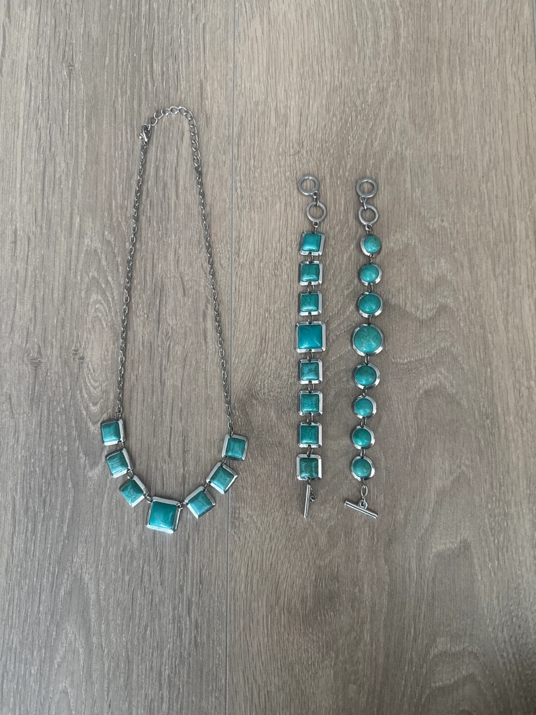 Turquoise beaded necklace and bracelet set. Features square and round turquoise-coloured stones set in a silver-toned metal. The bracelet has a toggle clasp closure. They are never worn and selling since im a student. I do discounts on bundles!!