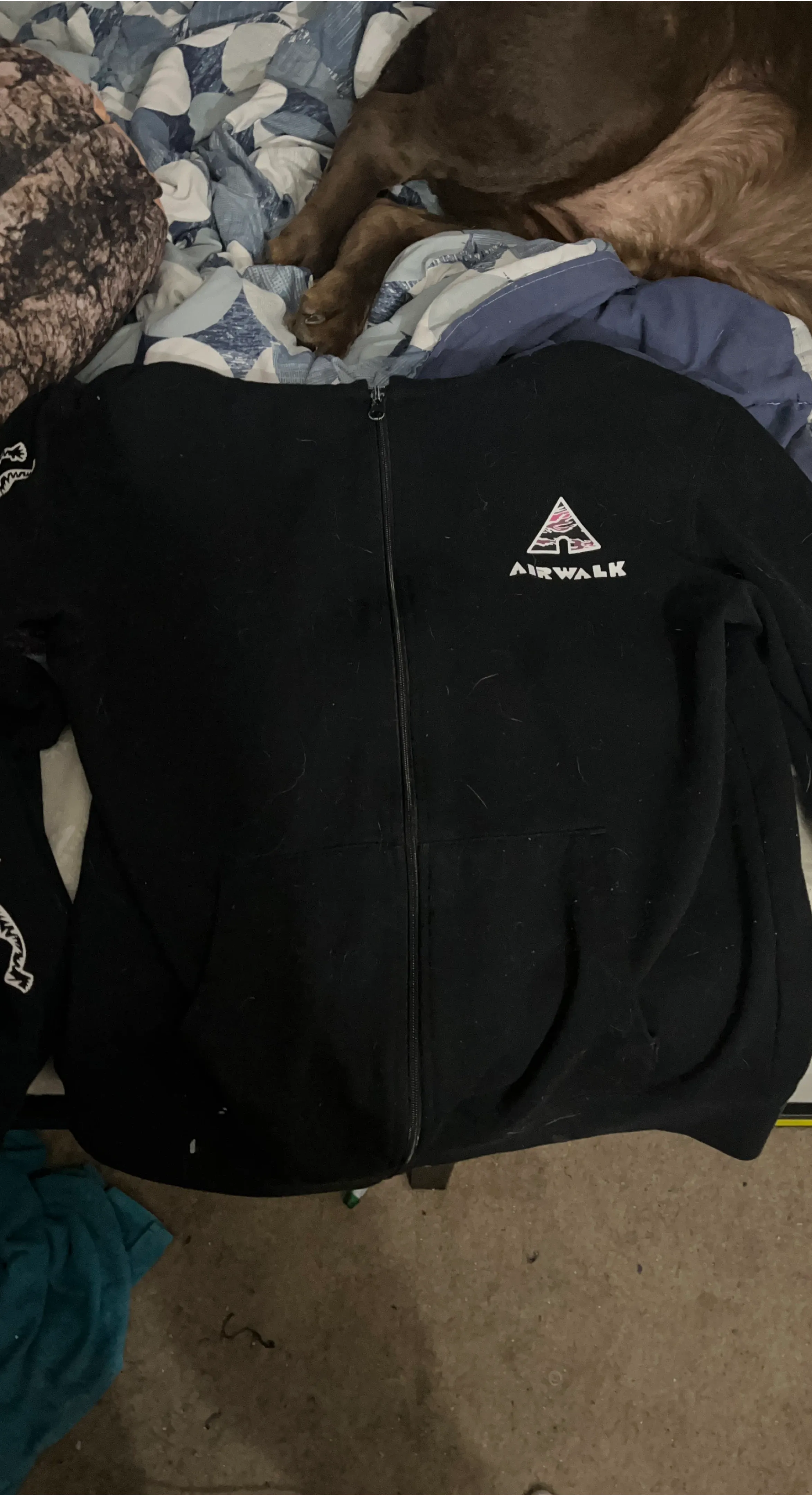 Black Airwalk full-zip hoodie with a graphic logo on the chest. It has a comfortable fleece lining and two front pockets. This hoodie is a great casual wear option.