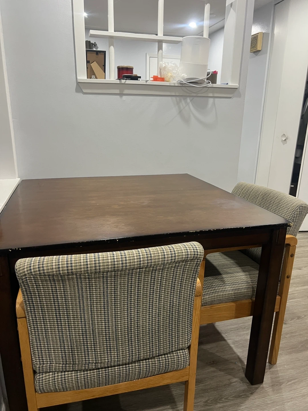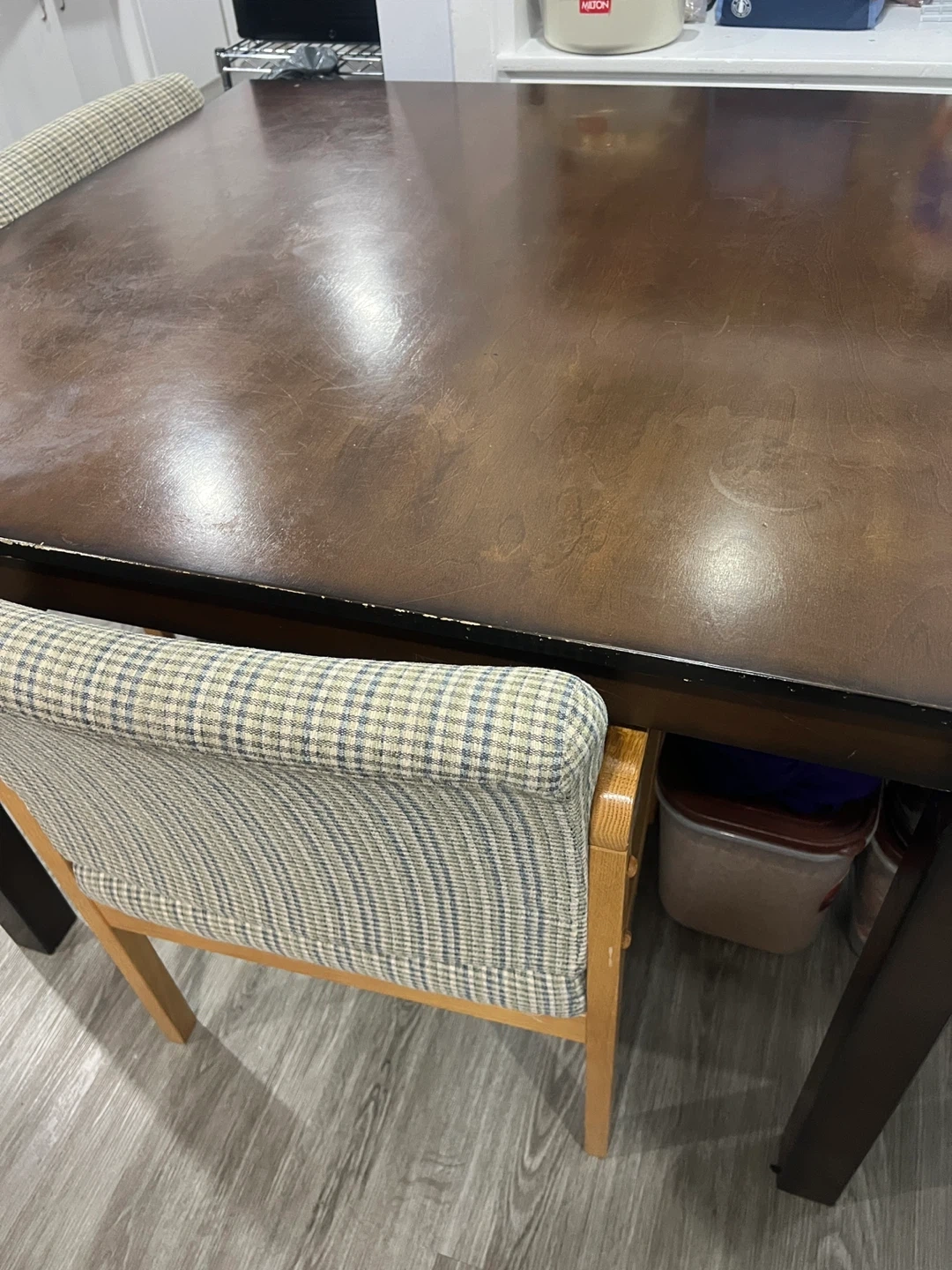 Dark wood dining table with checkered upholstered chairs. Perfect for a breakfast nook or smaller dining space. The chairs have sturdy wooden frames and comfortable seating.