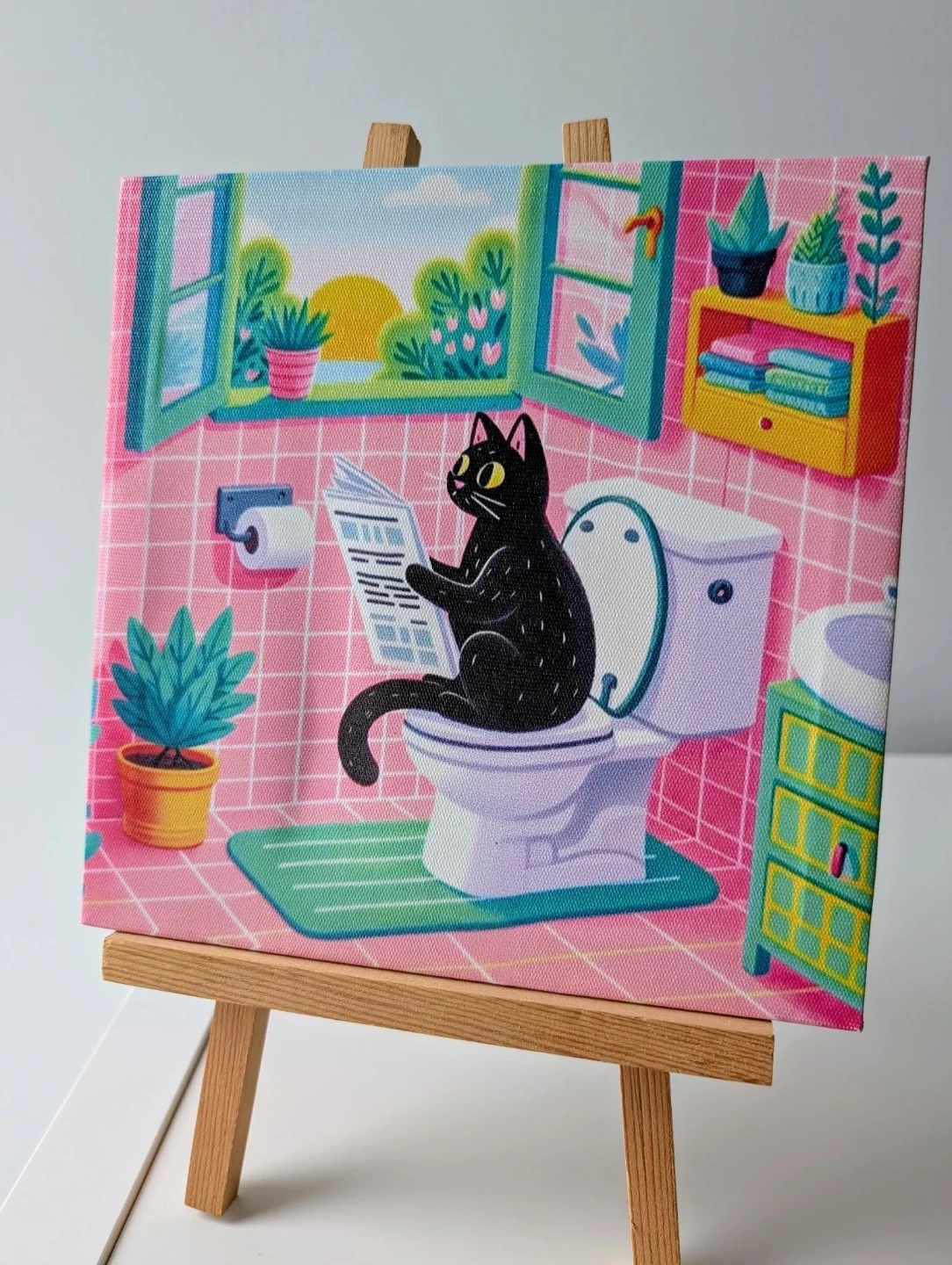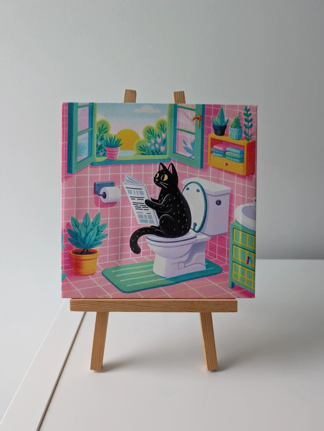 Fun canvas print featuring a black cat relaxing on the toilet and reading a newspaper. It's a colourful piece with a bathroom scene and a sunset view. Great for adding a touch of humour to your home decor!