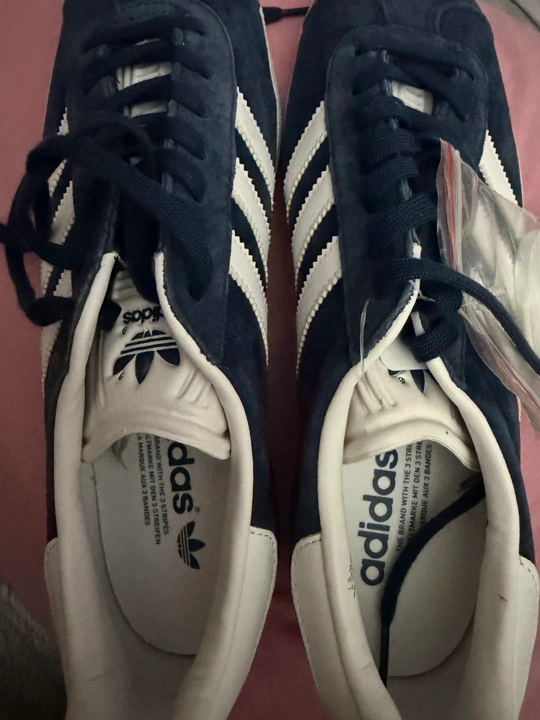 Classic Adidas Gazelle sneakers in a deep navy blue suede. These shoes feature the iconic three stripes and come with an extra pair of white laces. A timeless style for everyday wear!