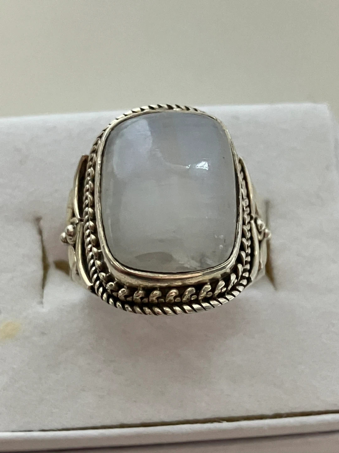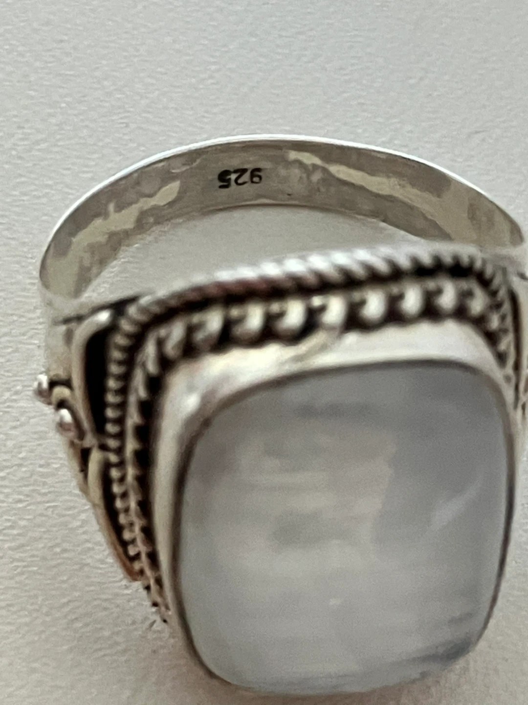 Pretty silver ring with a light blue moonstone. It's stamped 925 for sterling silver. The band has intricate detailing.