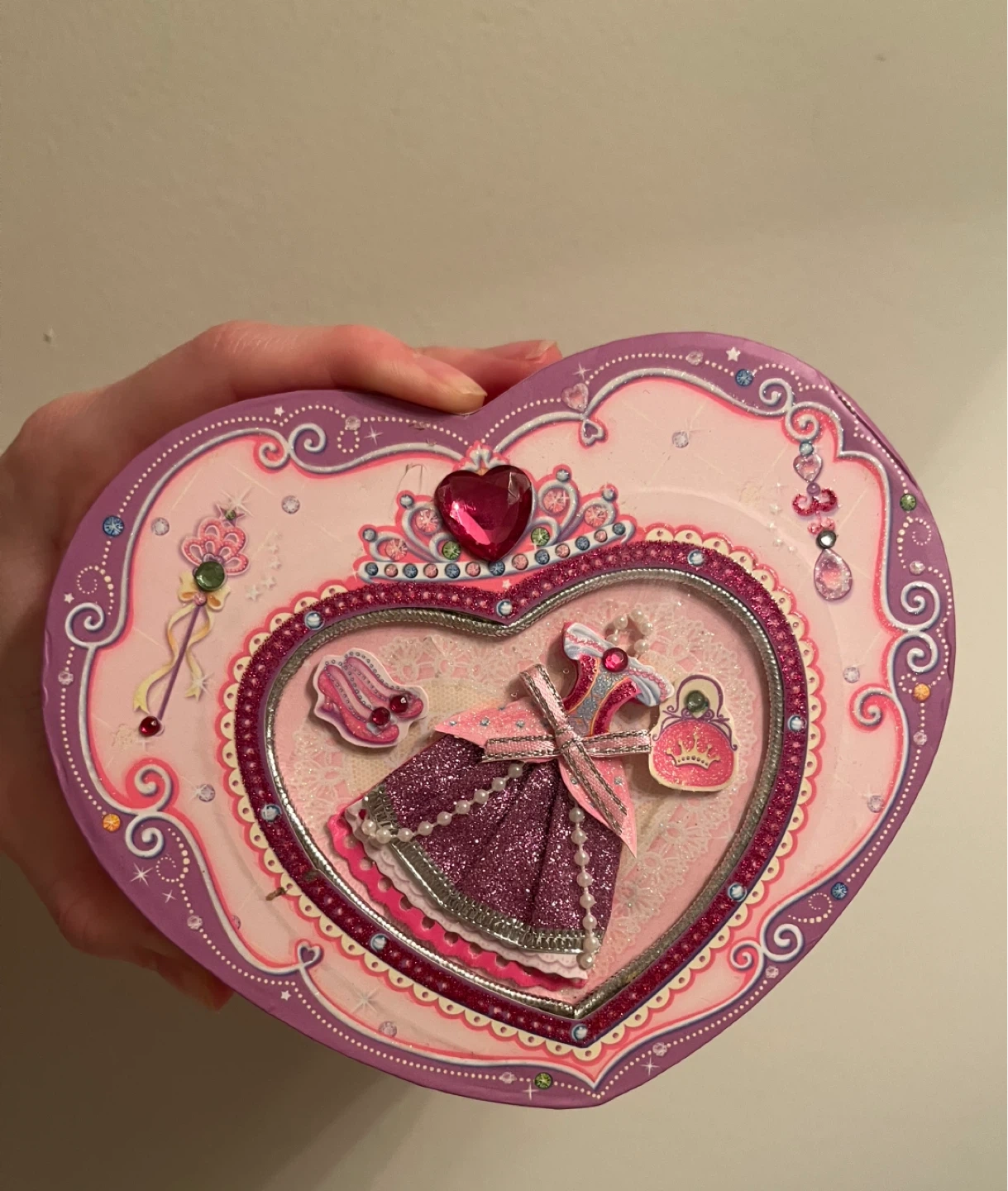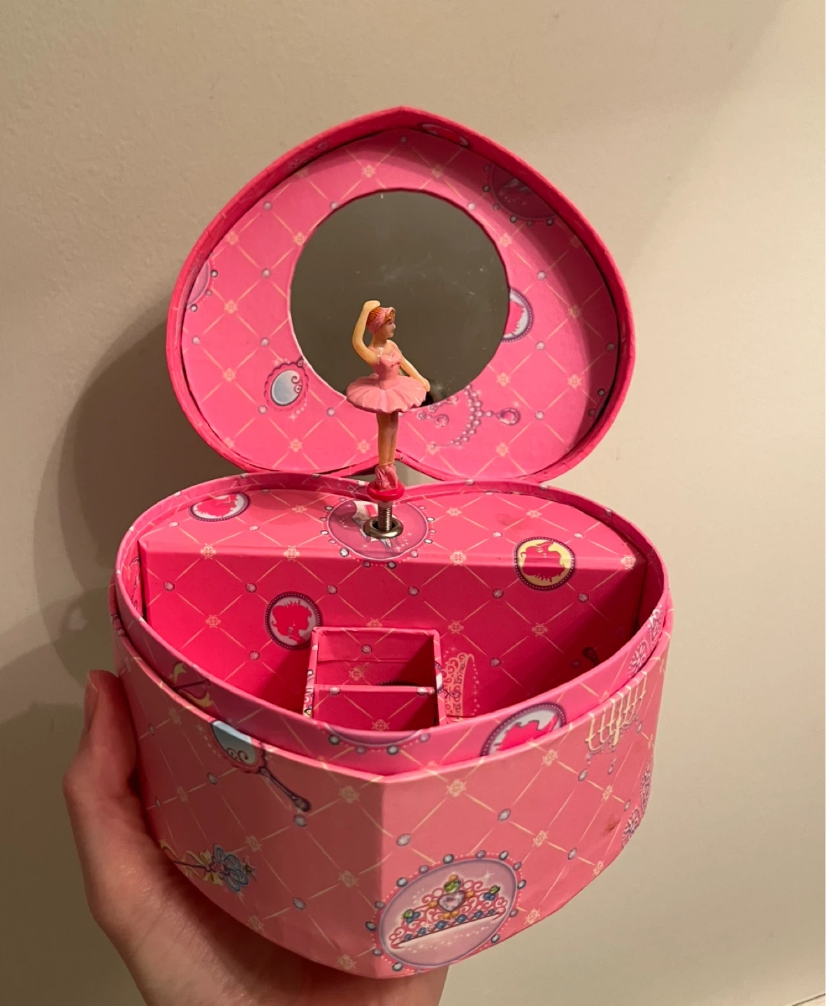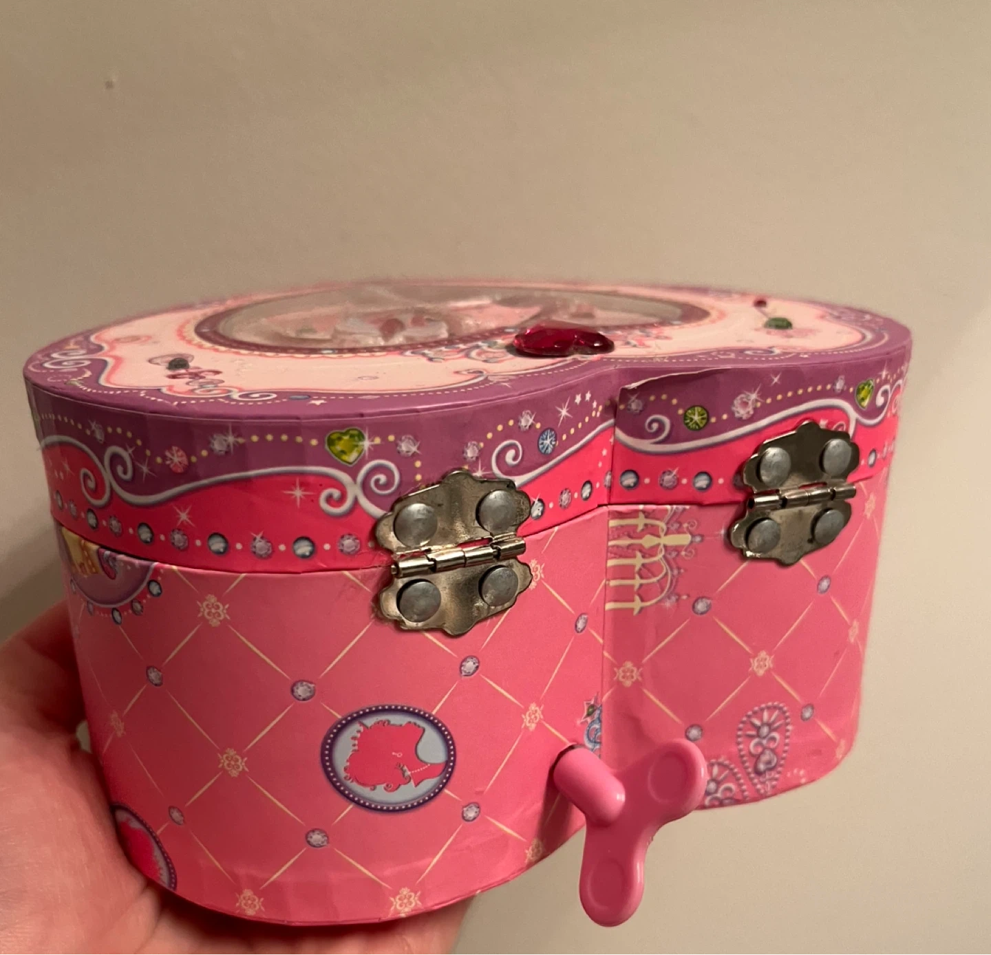 This sweet pink heart-shaped musical jewellery box features a spinning ballerina and a mirror inside. It has a winding key on the side for the music. The inside has a small compartment for trinkets. It's a lovely piece for keeping small treasures safe!