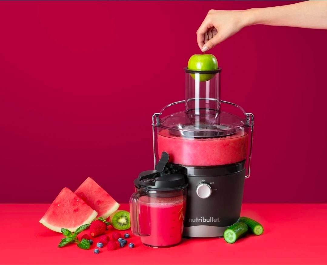 Enjoy fresh and nutritious juices with this grey NutriBullet Juicer, designed for easy and everyday use. This compact juicer features a streamlined design, a 3" wide feed chute, and dishwasher-safe parts.