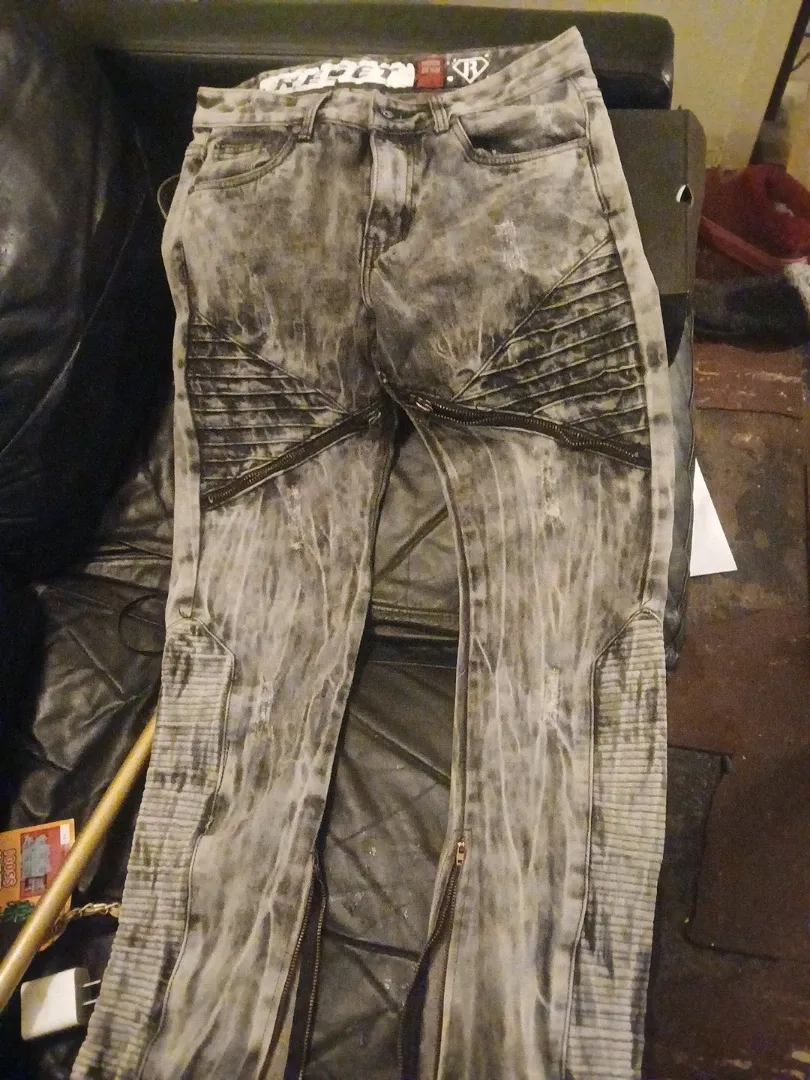 Selling a pair of REBEL8 moto denim jeans. They have a unique acid wash look with zipper details. Great for adding some edge to your wardrobe!