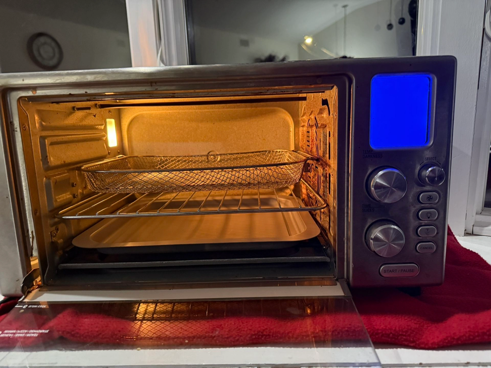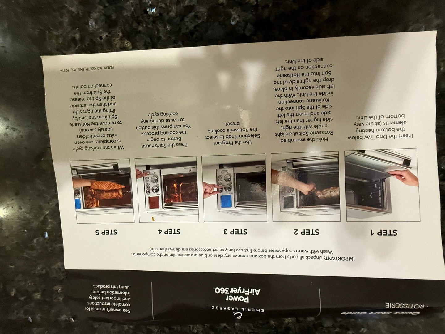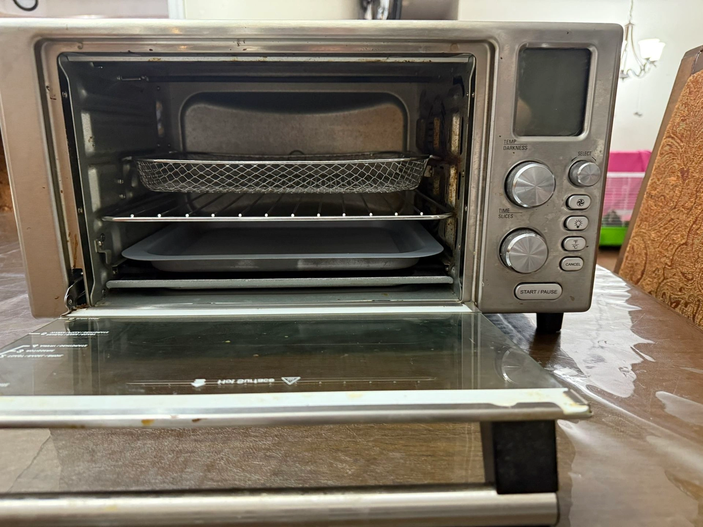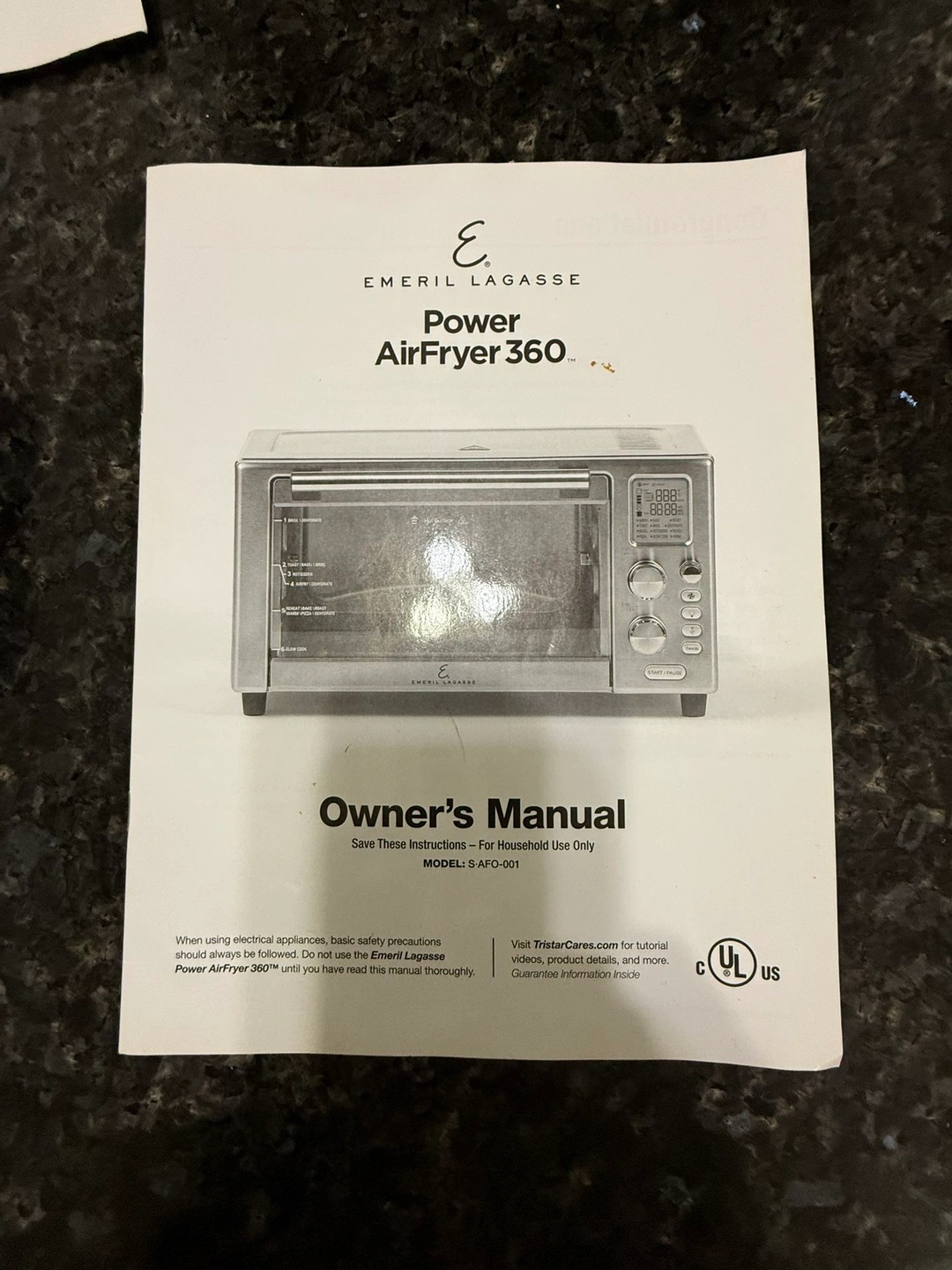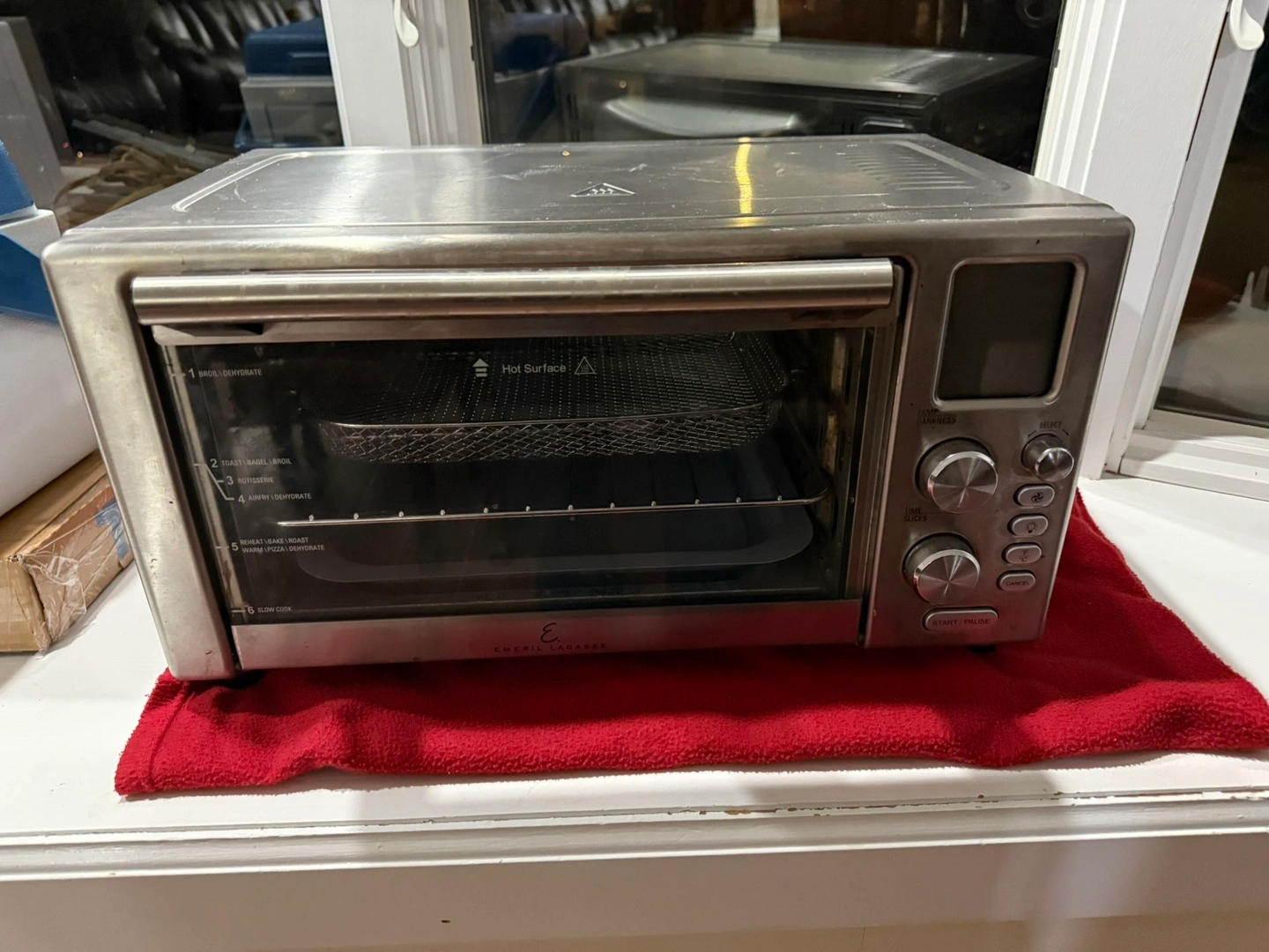 1500 watts, Model S - AFO-001. Features a large LCD screen and 12 functions. Includes Pizza Rack, Air Fryer crisper tray, baking pan, and drip pan. Functions include Broil, bake, toast, Air fry, Roast, Slow Cook, Reheat, and Dehydrate. Dimensions: 15.1" L x 19.3" W x 10.4" H. Excellent condition, used only 8 times. Comes with the owner's manual, all original paperwork, and recipe book.