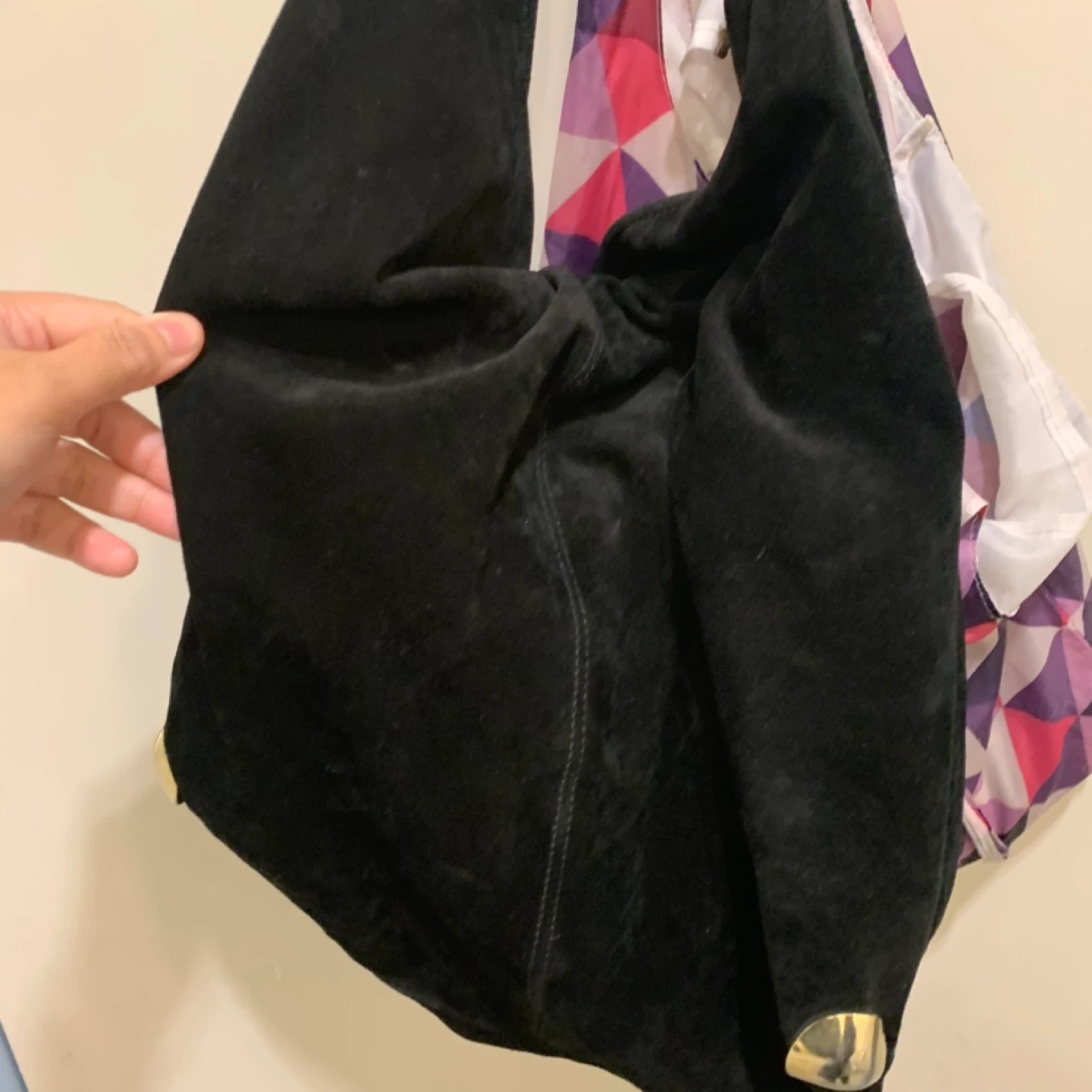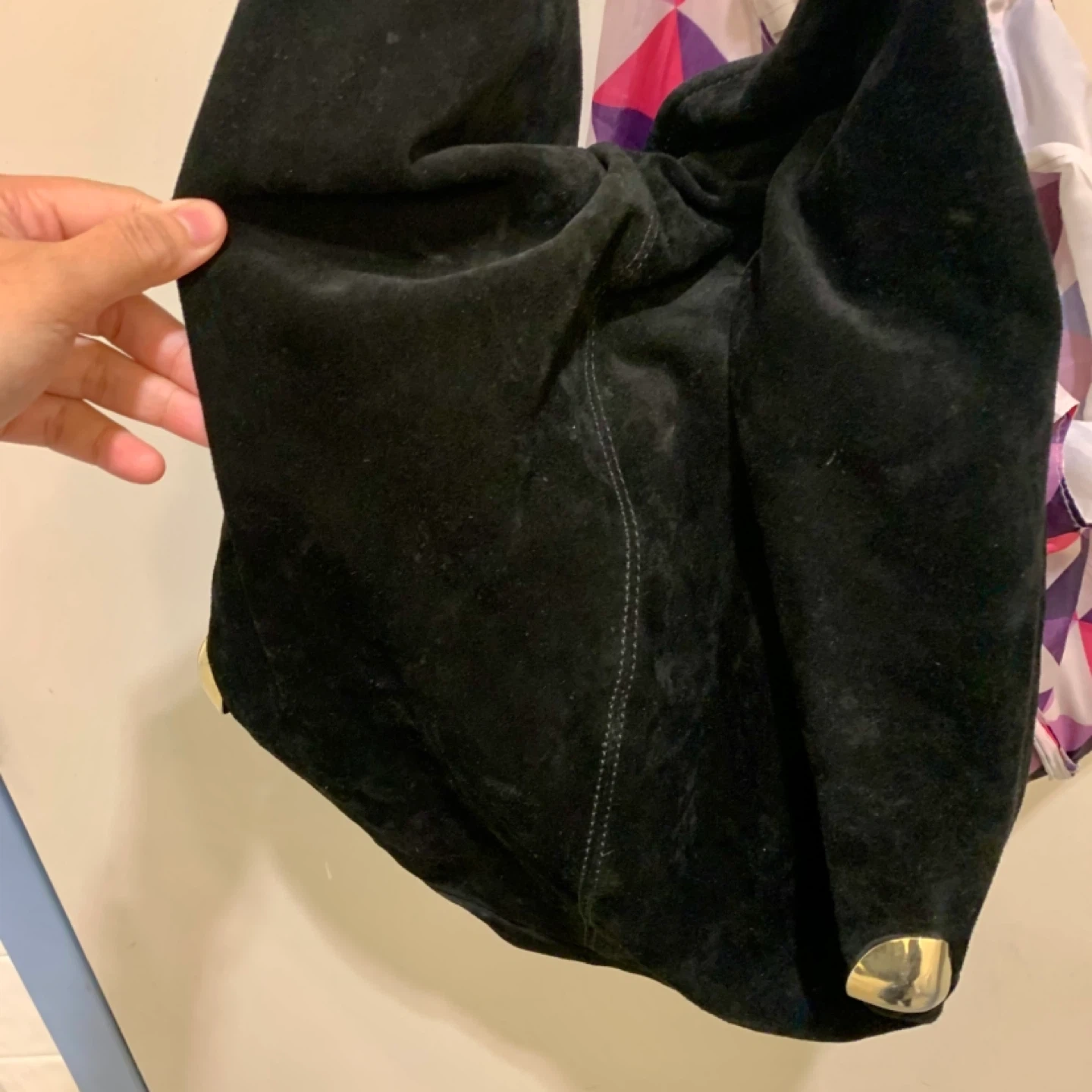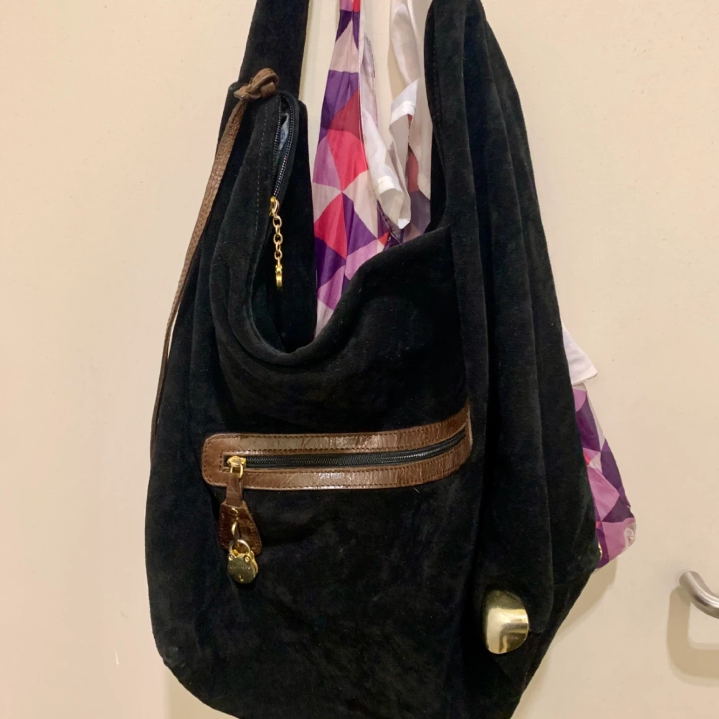 Stylish Jannice hobo bag made from soft black suede. It features a front zippered pocket with leather trim and gold-tone hardware. This bag is perfect for everyday use!