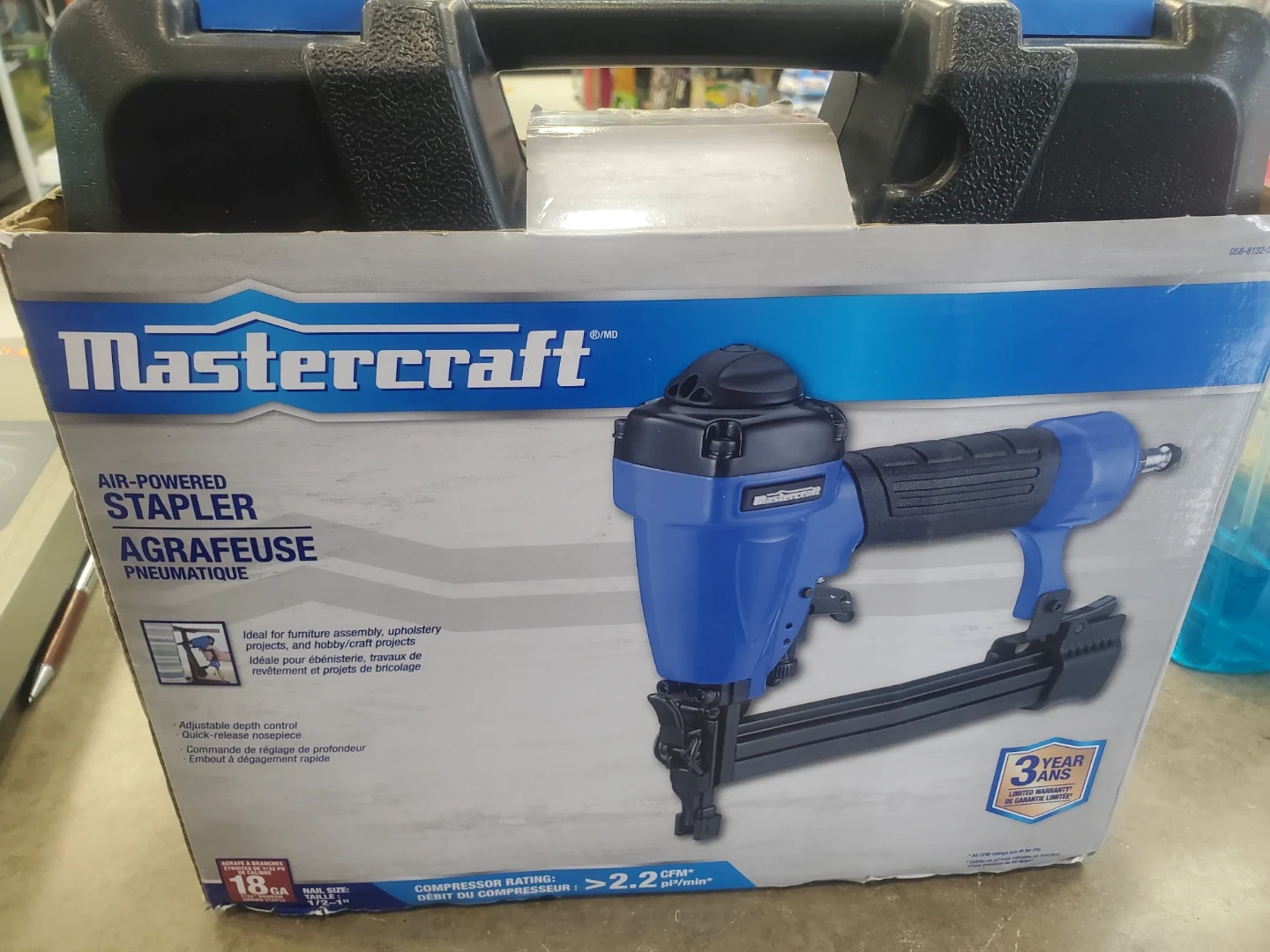 This Mastercraft air-powered stapler is ideal for furniture assembly, upholstery projects, and hobby/craft projects. It features adjustable depth control and a quick-release nosepiece. It's suitable for 18-gauge nails.