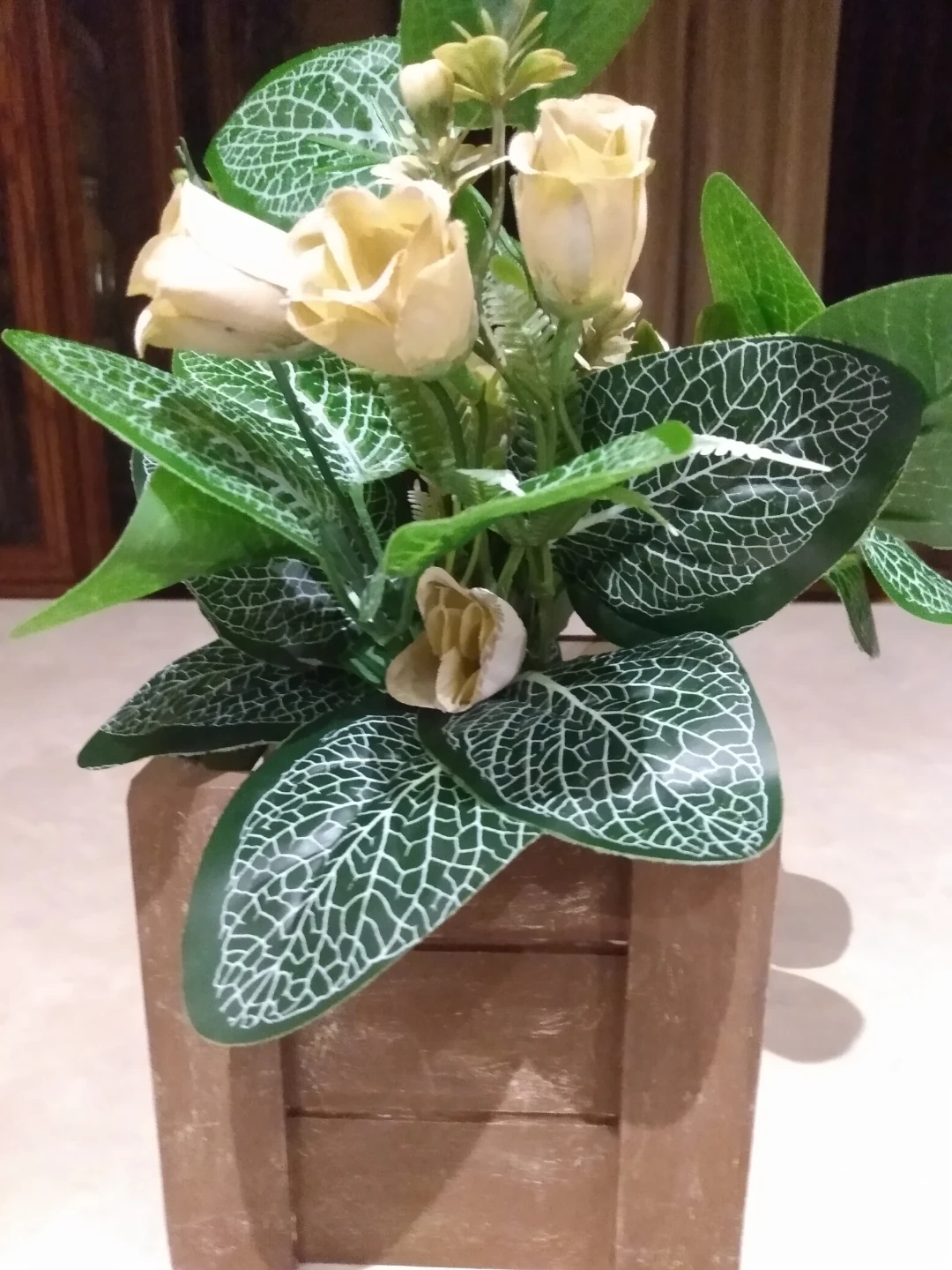 Realistic Flower Arrangement in Wooden 5x5" Planter Box