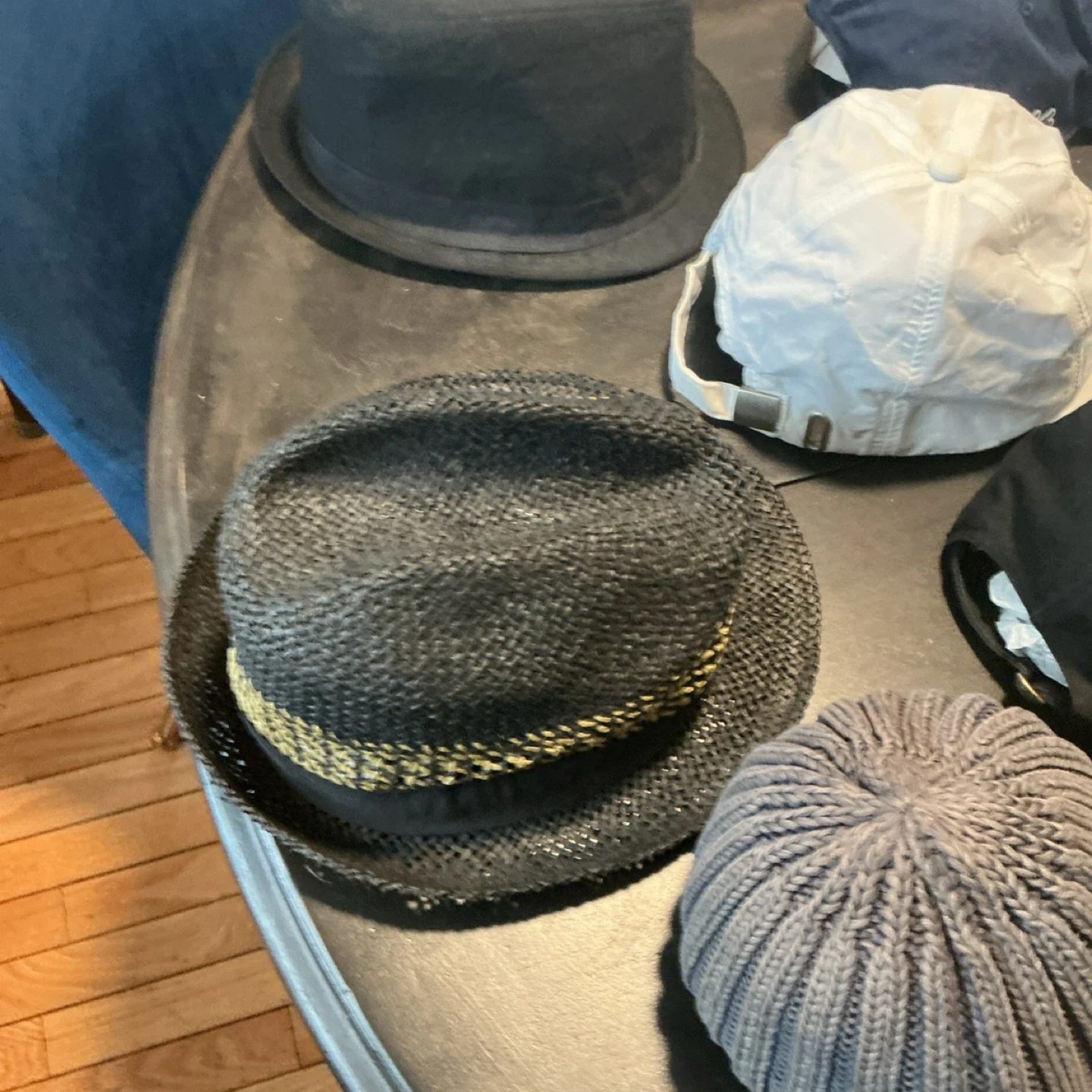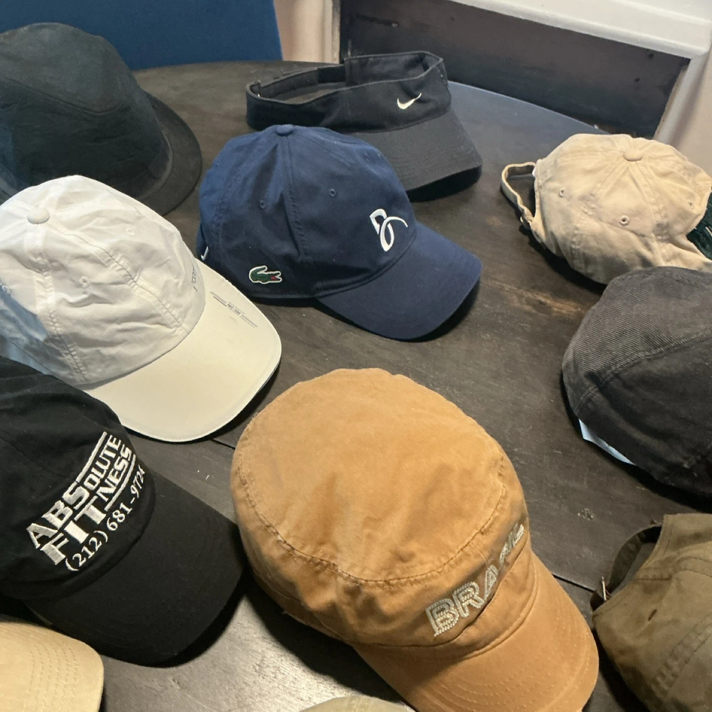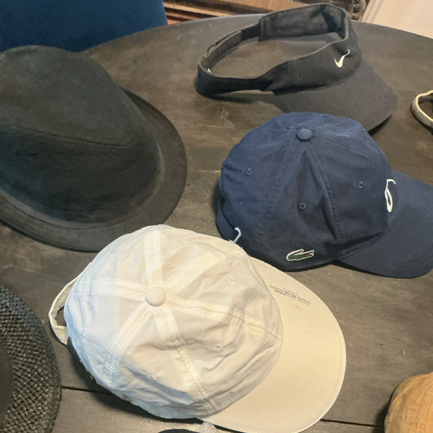 Collection of hats and caps including a black fedora, a woven straw hat with a decorative band, and various baseball caps. Brands visible include Lacoste and Nike. Materials vary from woven straw to cotton and knit.