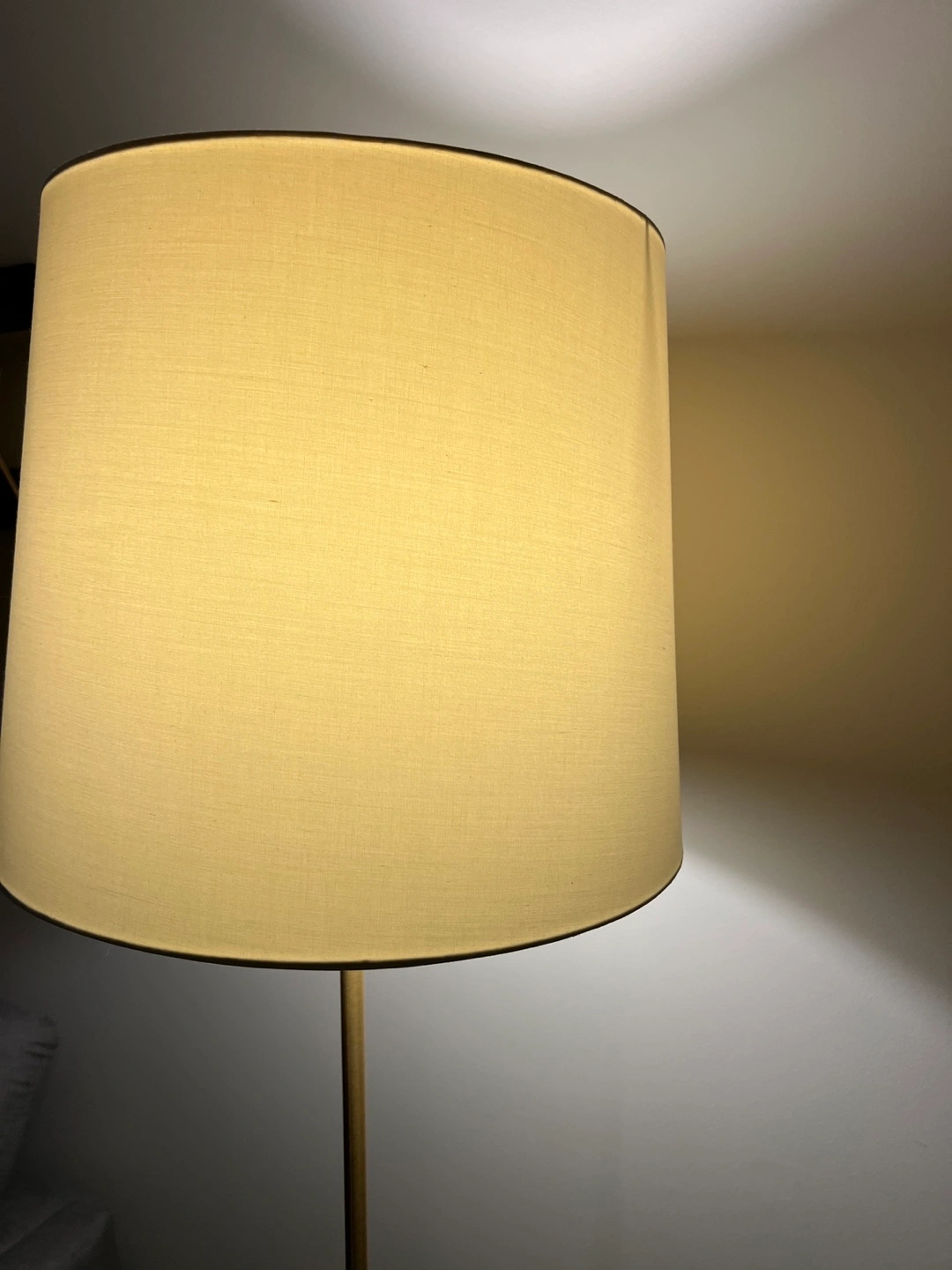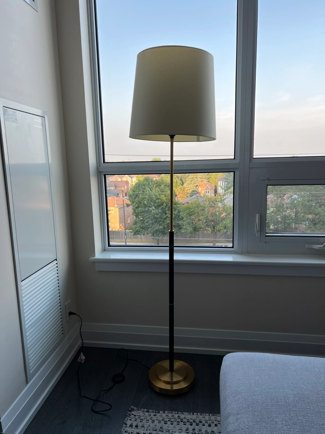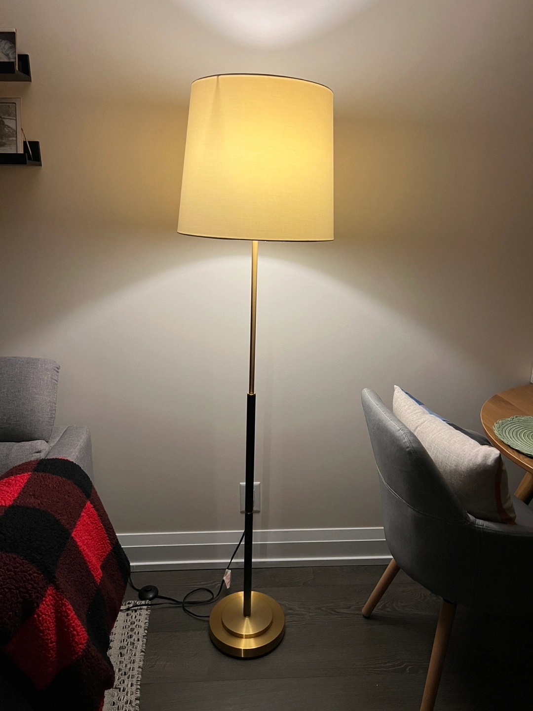 Selling a floor lamp with a gold base and black accents! It has a neutral-coloured shade and a convenient foot switch on the cord