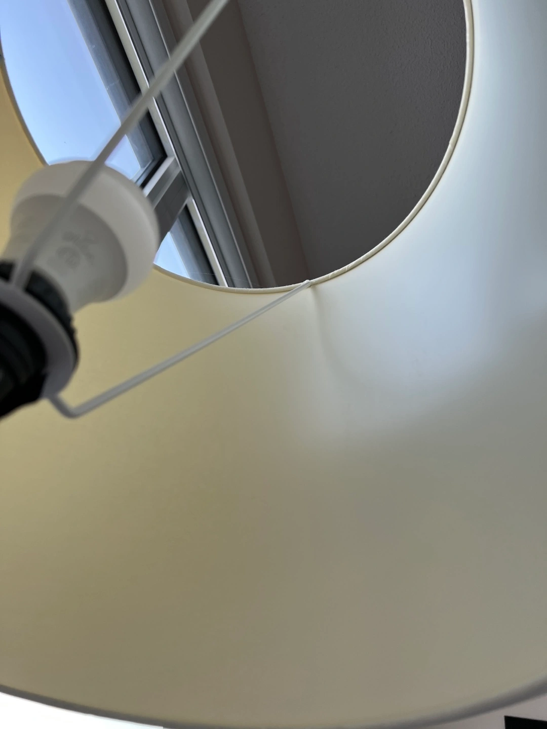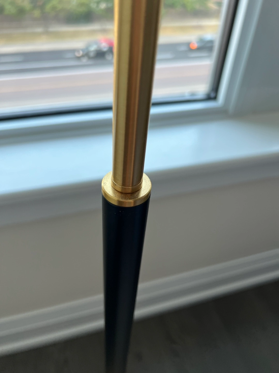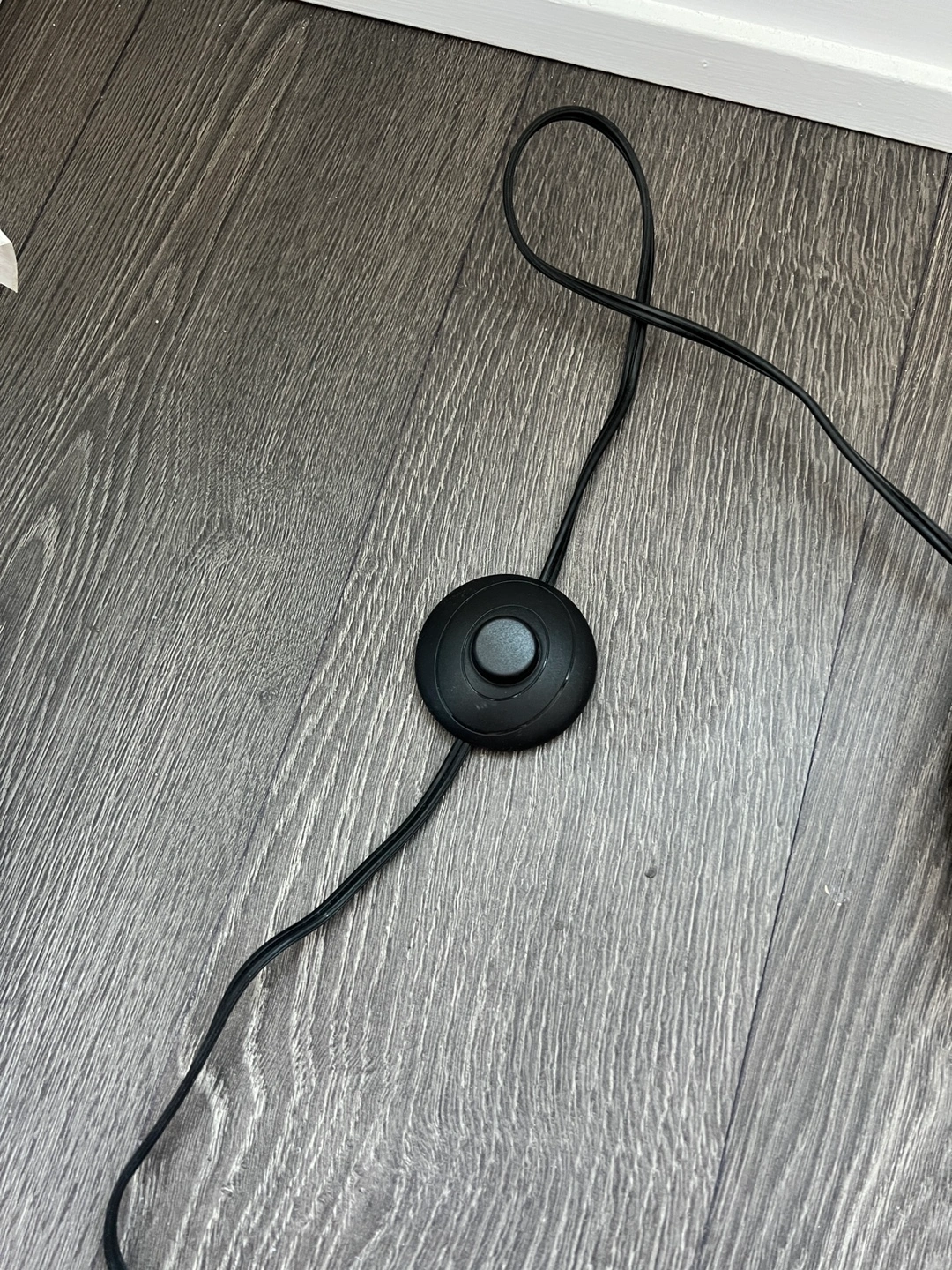 Selling a floor lamp with a gold base and black accents! It has a neutral-coloured shade and a convenient foot switch on the cord