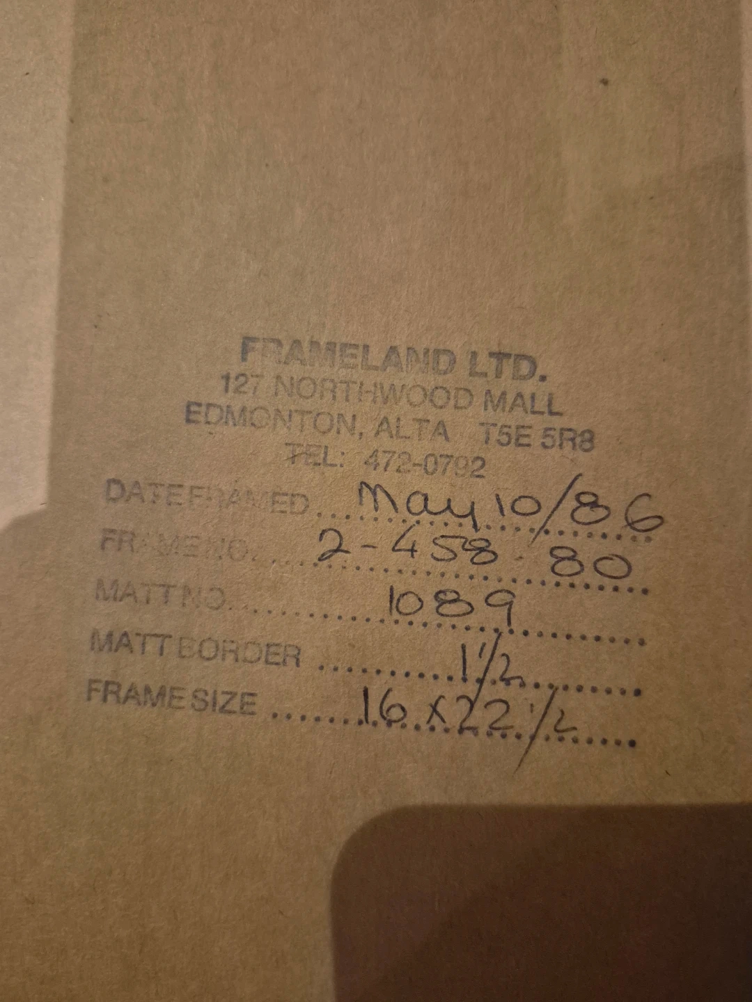 Framed needlepoint art with a wooden frame. The frame size is 16 x 22 1/2 inches. The date framed was May 10, 1986.