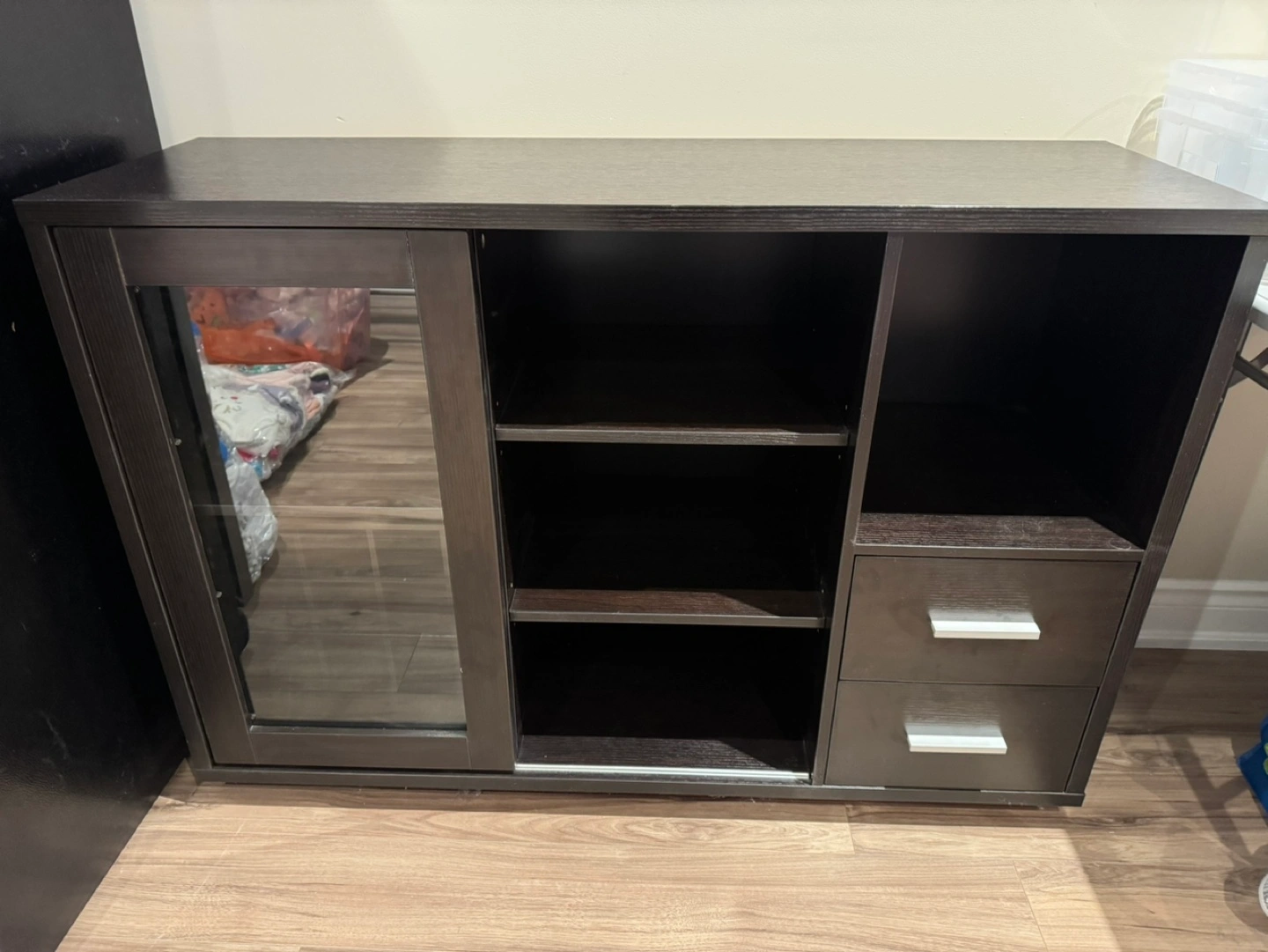 Modern media console. Features a sliding glass door, open shelving, and two drawers. Dark brown finish. Good for living room or dining room