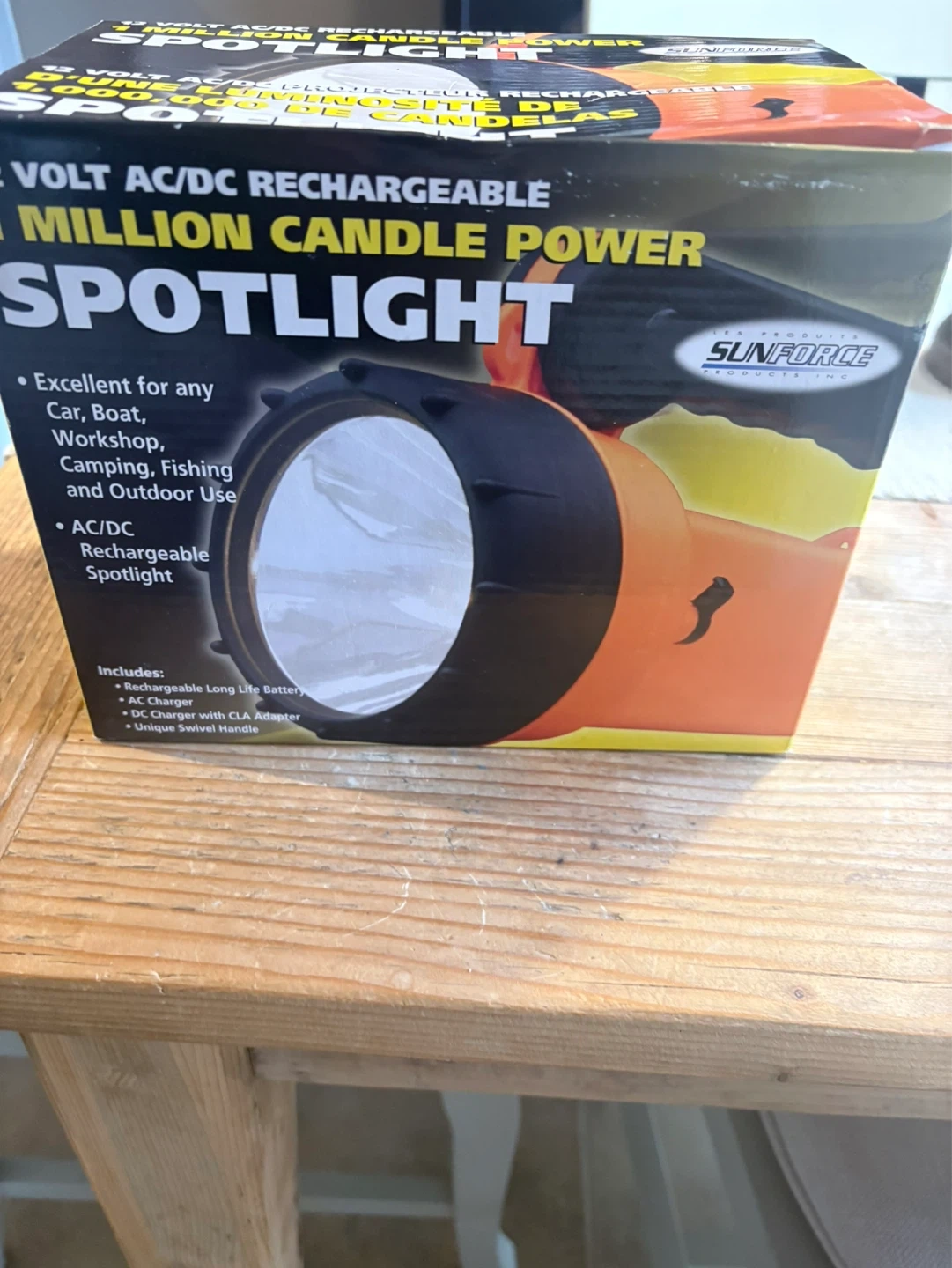 This Sunforce spotlight offers 1 million candle power and is AC/DC rechargeable. It's excellent for car, boat, workshop, camping, fishing, and outdoor use. Includes a rechargeable long-life battery and AC charger.