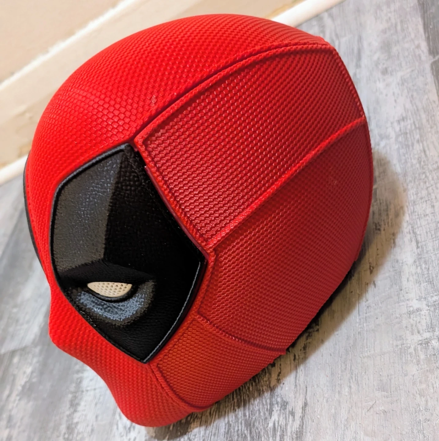 This is a 3D printed helmet of a Marvel antihero Deadpool. It's made of a textured red material with black accents for the eyes. It's magnetic.
