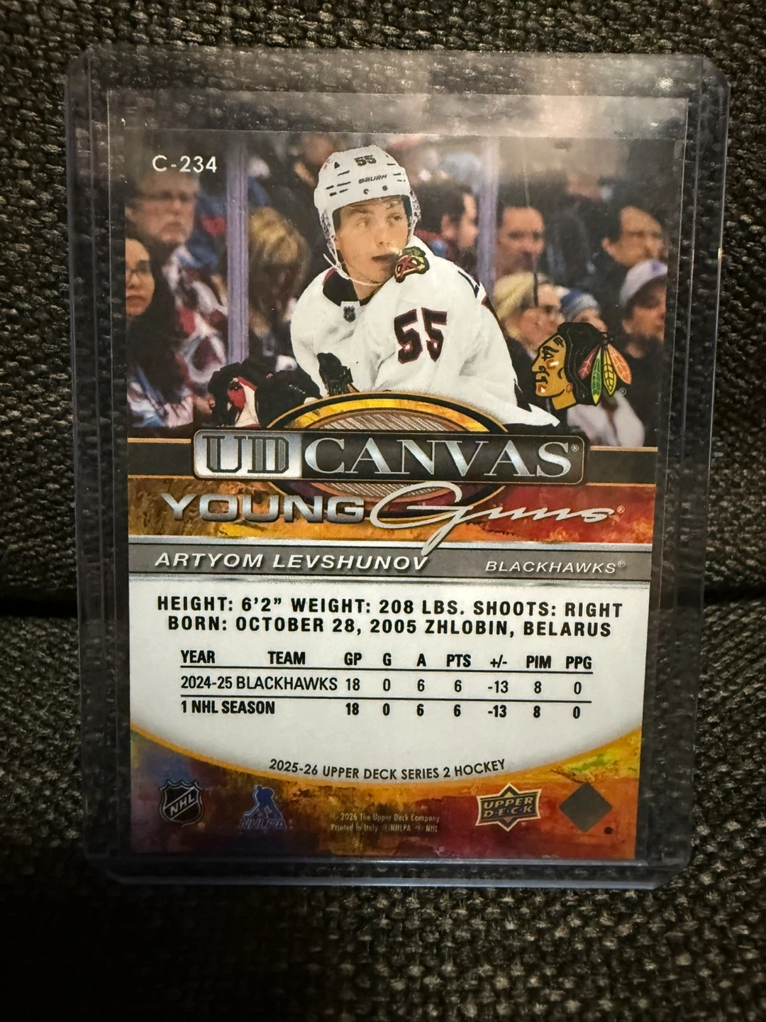 This is an Upper Deck Young Guns rookie card for Artyom Levshunov of the Blackhawks. It's from the 2025-26 Upper Deck Series 2 Hockey set. Levshunov is listed at 6'2" and 208 lbs.