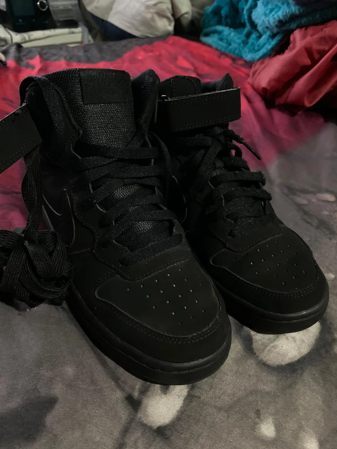Black Nike Air Force 1 high top sneakers for youth. Size 7Y. These shoes are black with a lace-up closure and a velcro strap at the top. Made in Indonesia.