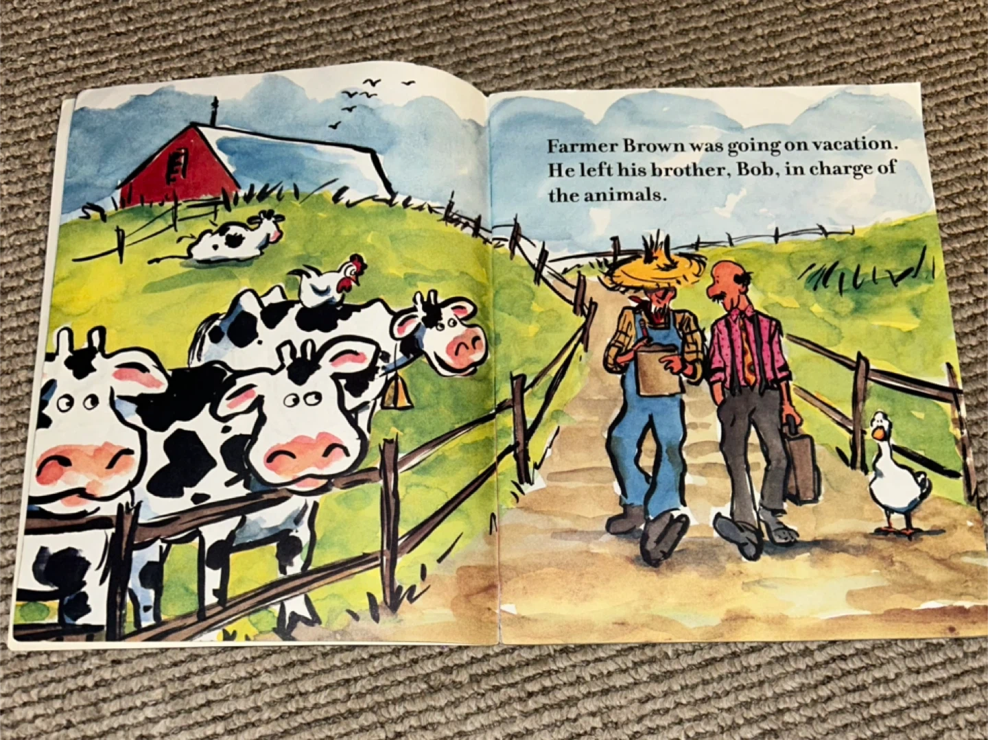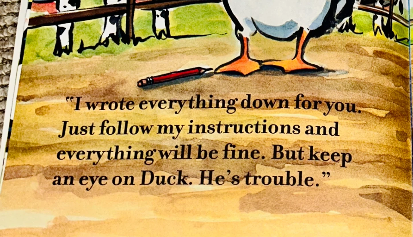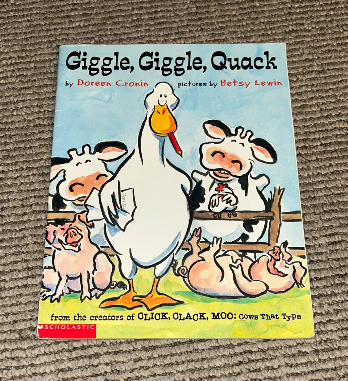 This is the children's book "Giggle, Giggle, Quack" written by Doreen Cronin and illustrated by Betsy Lewin. If you haven’t read the popular and hilarious "Click, Clack, Moo—cows that type” please, go, find it! It is a must read! And this book is just as good. What will a duck do with a pencil? When Farmer Brown is away, the barnyard will play!