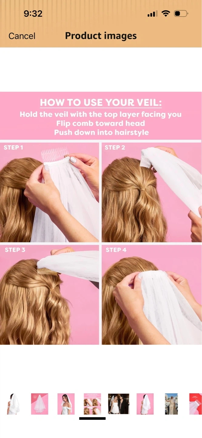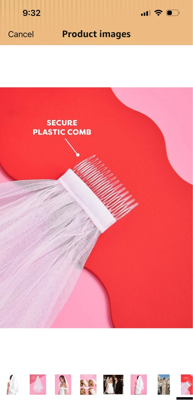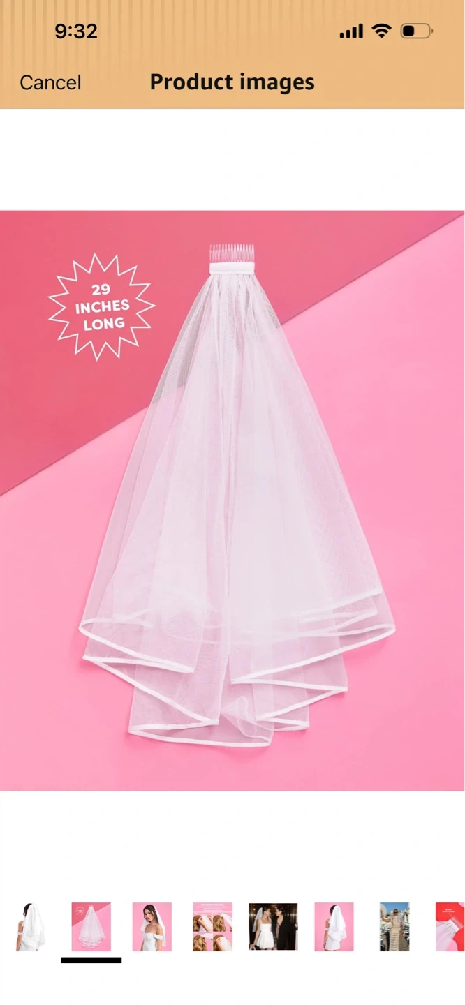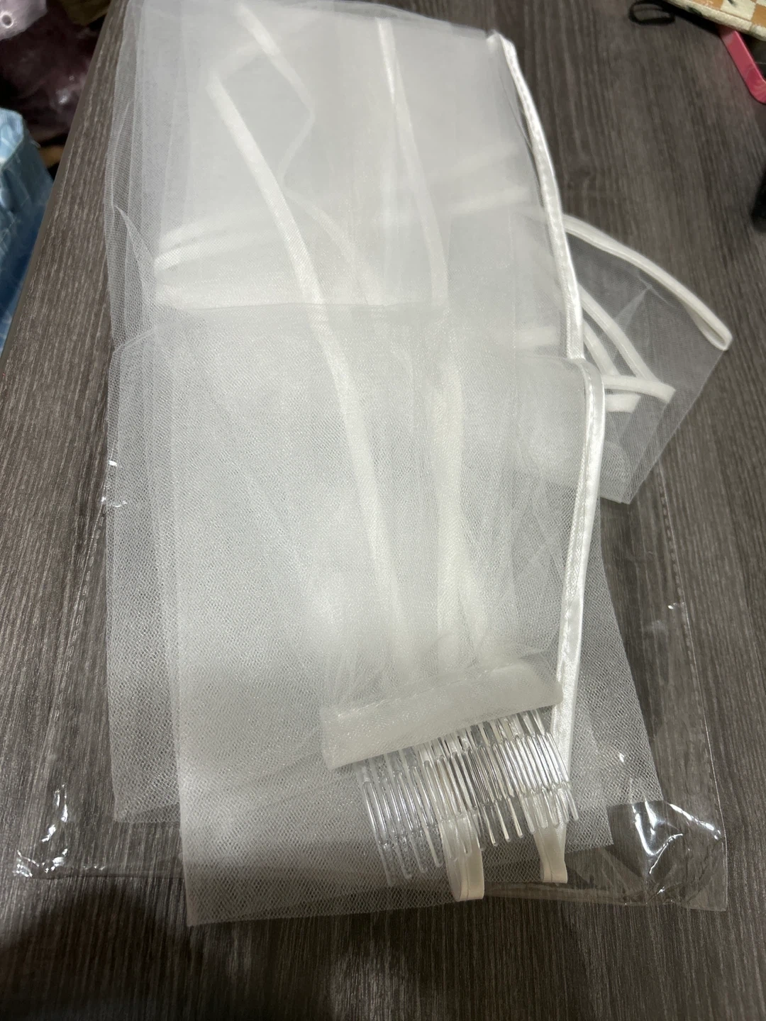 This new white wedding veil is 30 inches long and includes a secure plastic comb for easy attachment. It's made from sheer netting with a ribbon trim. Perfect for a bridal ceremony!