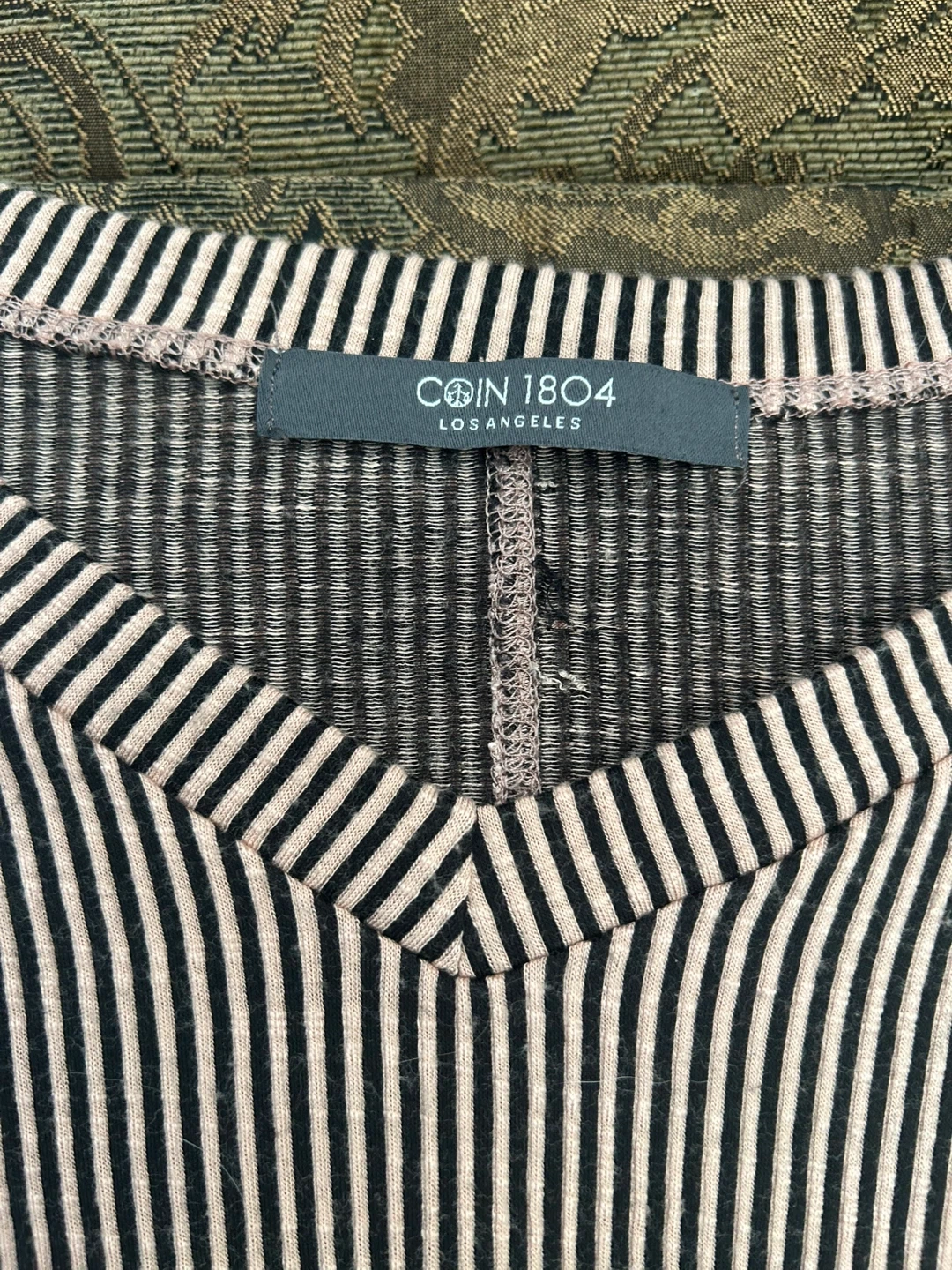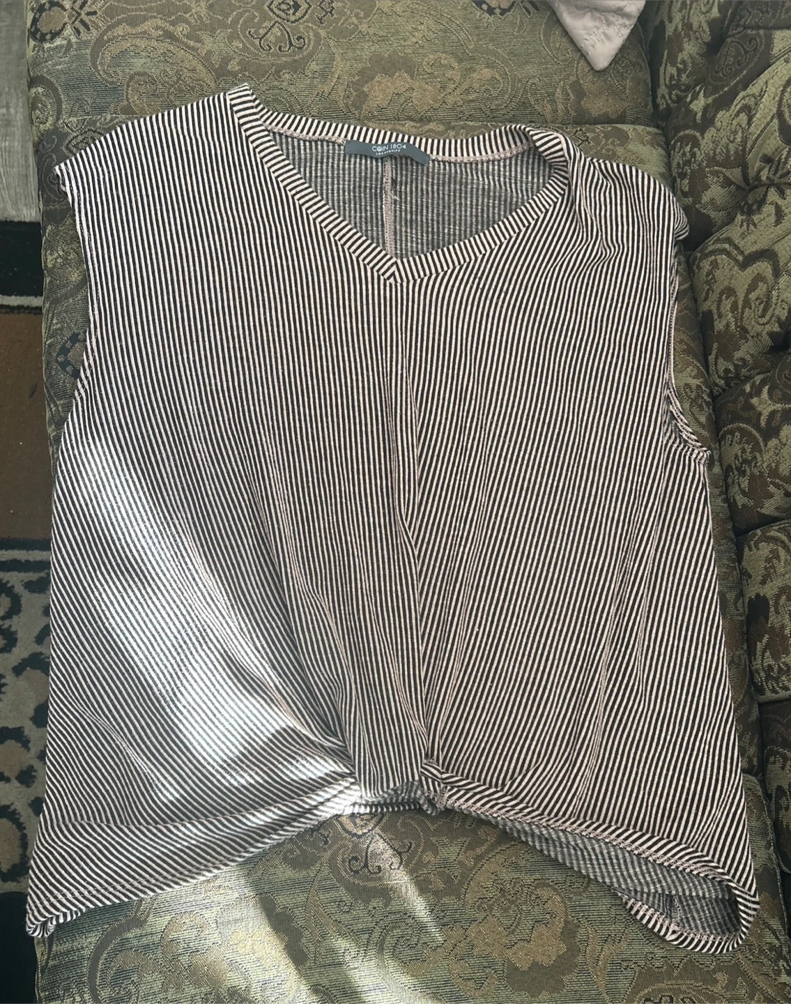 This COIN 1804 sleeveless top features a vertical stripe pattern and a twist front detail. It's made of 50% polyester, 46% rayon, and 4% spandex. Tag indicates size XL. Hand wash cold, lay flat or hang dry, and low iron if needed.