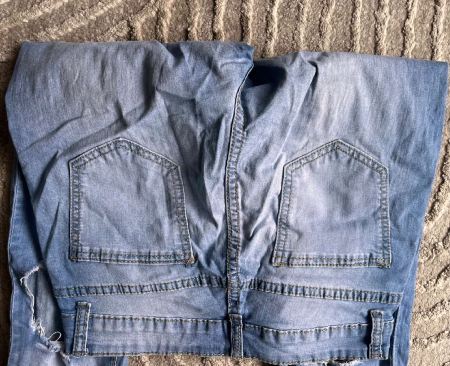 These are light wash skinny jeans with rips at the knees. They're made of denim. Great for a casual look!