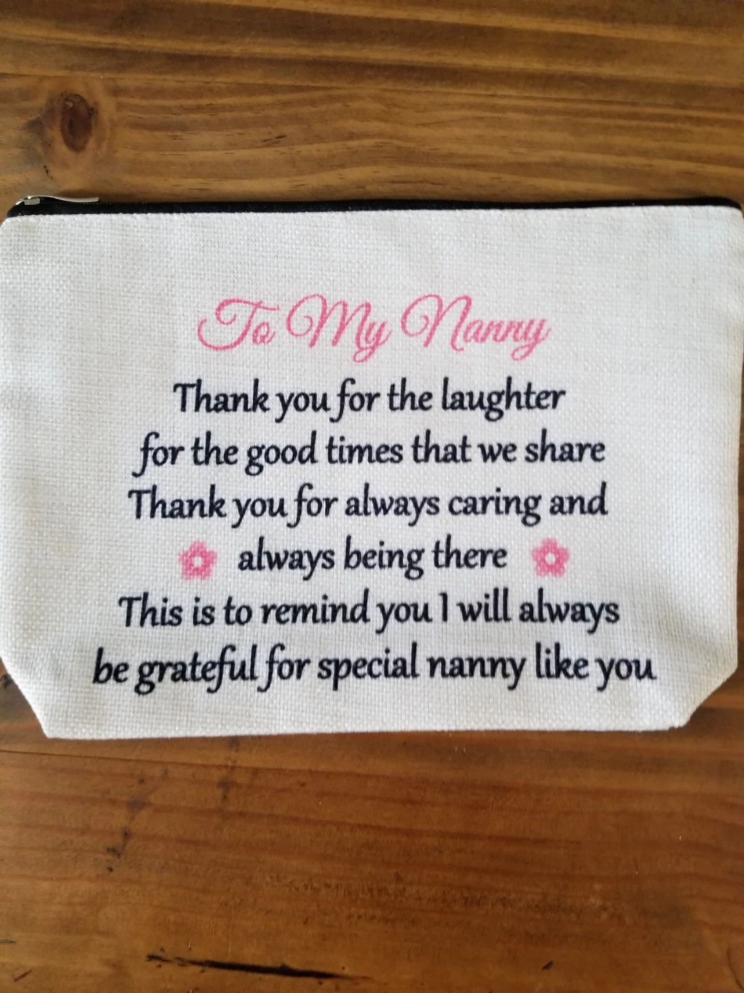 This is a white cosmetic bag with text that reads 'To My Nanny' and a heartfelt message. It's made of a canvas-like material and features a zipper closure. The bag is perfect for storing makeup or small essentials as a thoughtful gift. Brand new