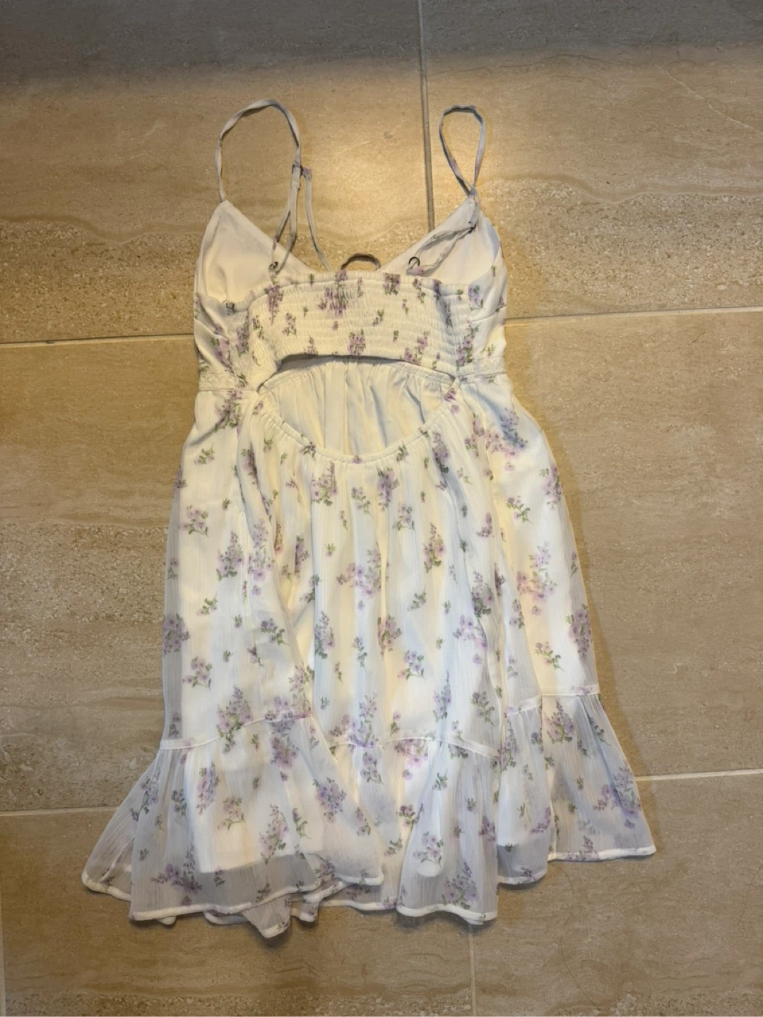 White floral babydoll dress with purple accents. Lace trim detail. Size XS. Perfect for summer outings! WORN ONCE FOR PHOTOS