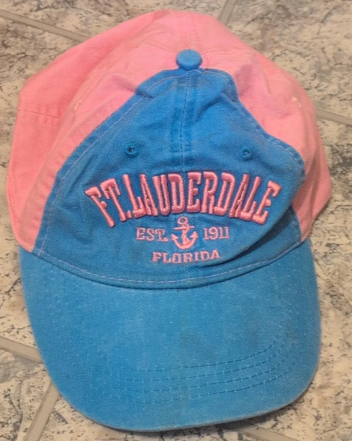 This is a two-tone baseball cap with 'Ft. Lauderdale EST. 1911 FLORIDA' embroidered on the front. The cap is pink and blue. It's a great souvenir from Florida!
