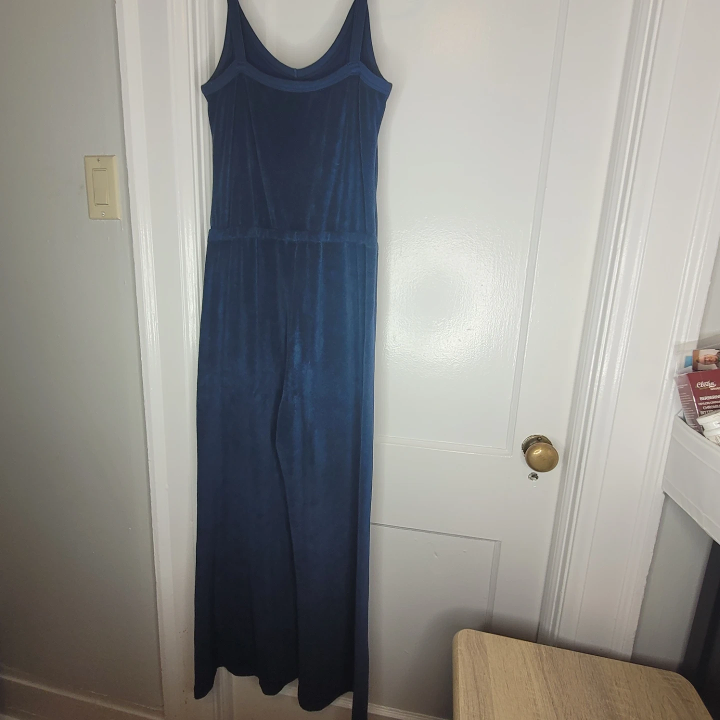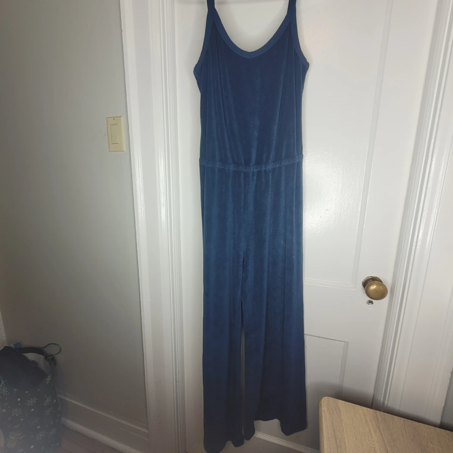 Velvet jumpsuit by Suzie Kond. Features spaghetti straps and a wide leg silhouette. It's made of a soft Terry cloth material for a comfortable feel. Has some stains just haven't tried getting out hence price