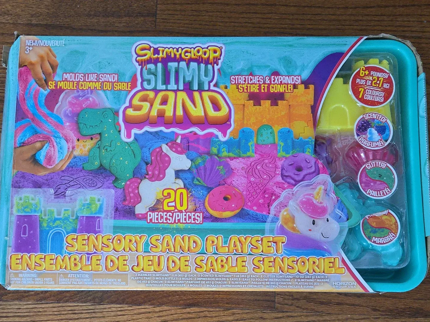 This is the Slimy Gloop Sensory Sand Playset, featuring 20 pieces. It includes marbled, scented, and glitter sand, along with molds and a tray. The sand molds like sand and stretches, making it fun for creative play!
