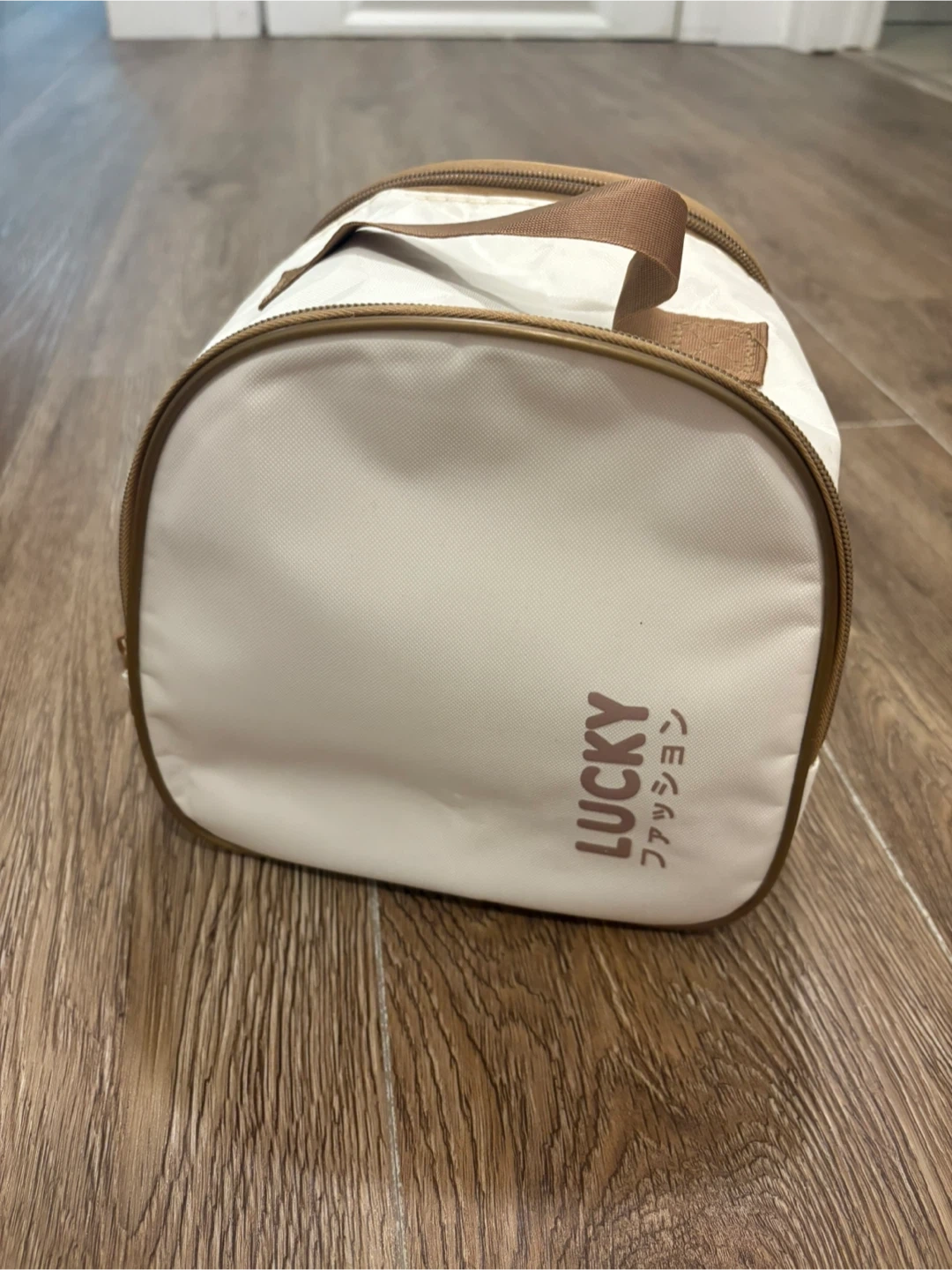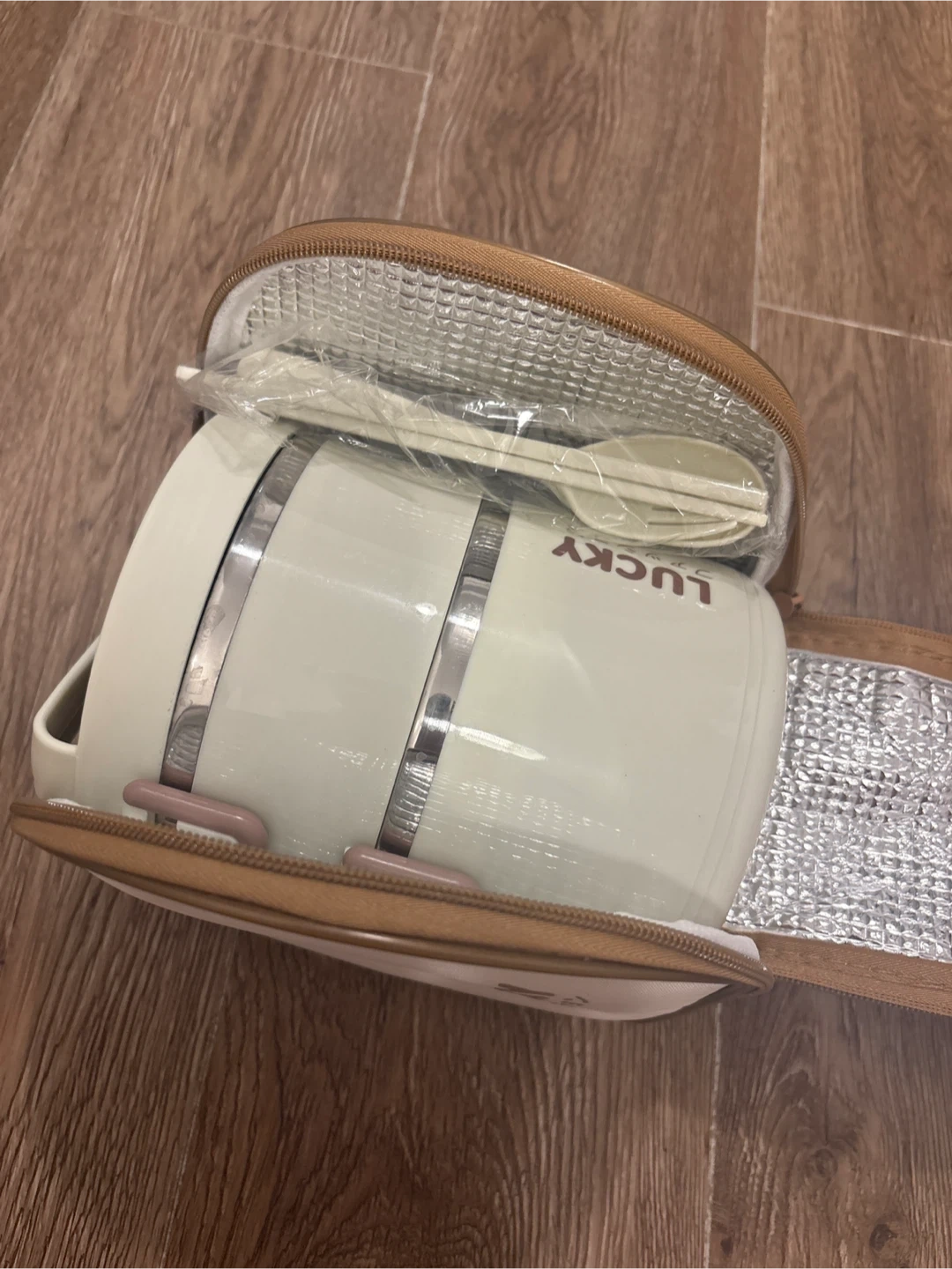 This is a Lucky Fashion insulated lunch box with two tiers. It includes a set of cutlery. The interior is insulated for keeping food warm or cold. It's perfect for carrying meals to work or school. Never used