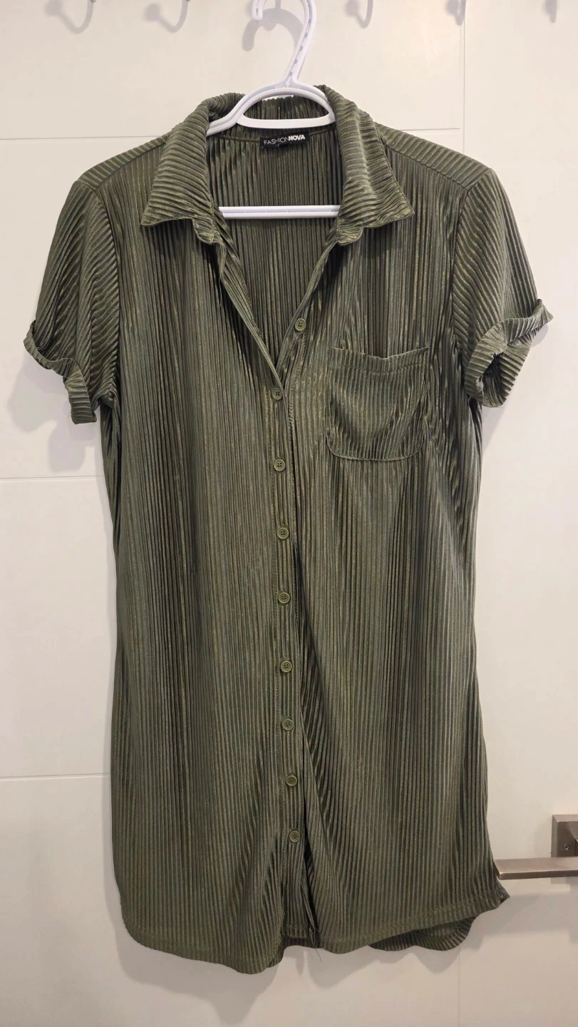 Fashion Nova collared button-up shirt dress in a striking olive green colour. It's made of 100% polyester with a distinctive ribbed texture. This dress features short sleeves and a chest pocket. Size is large.