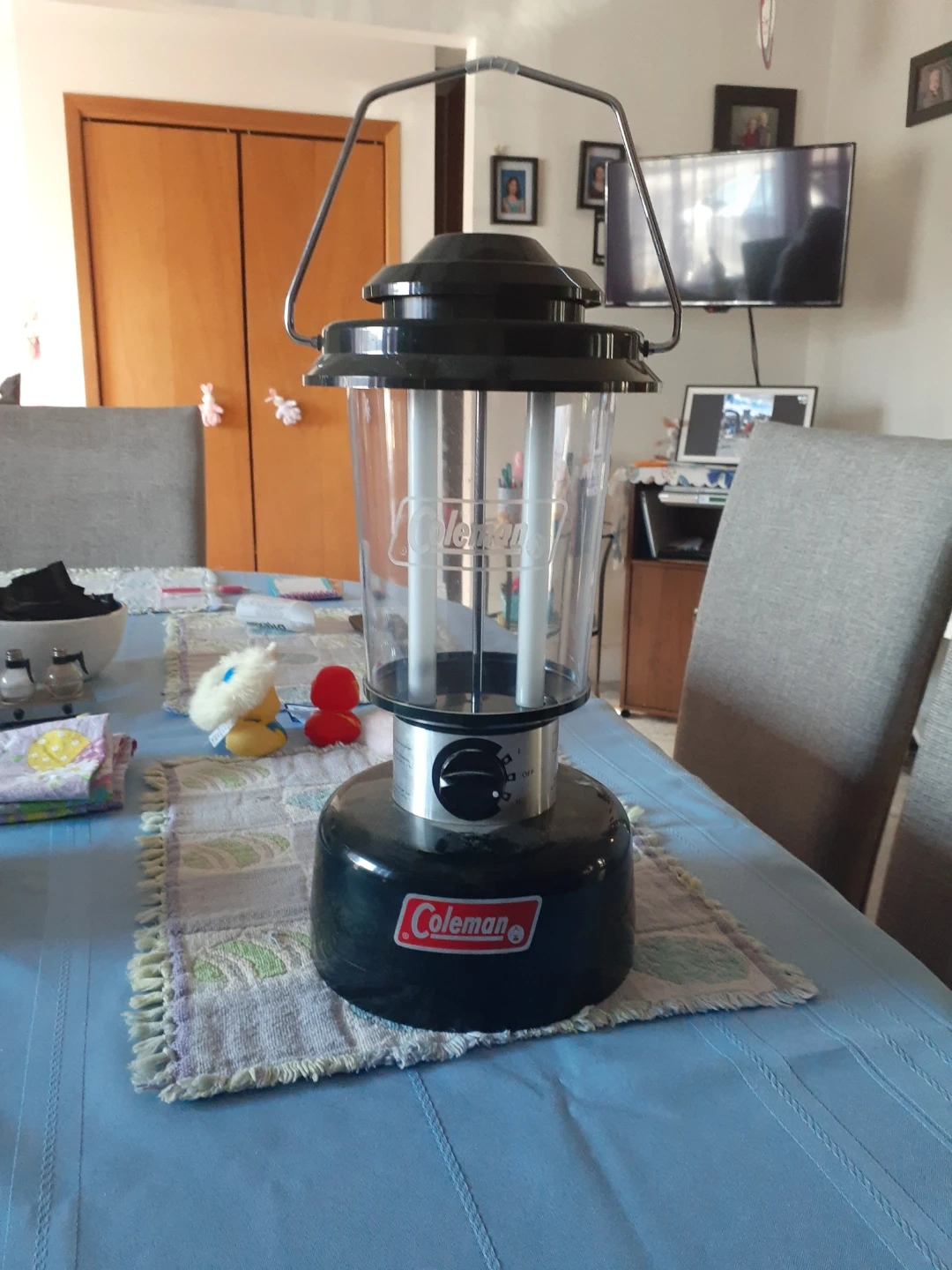 This is a Coleman brand lantern with twin fluorescent tubes. It has a dial control for brightness settings. It's great for camping or power outages! Never used