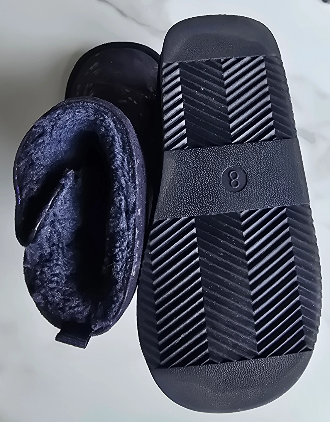 Dark blue boots. Decorated with a silver pattern. Lined with a soft material. Would be lovely to slip into after a cold day outside.