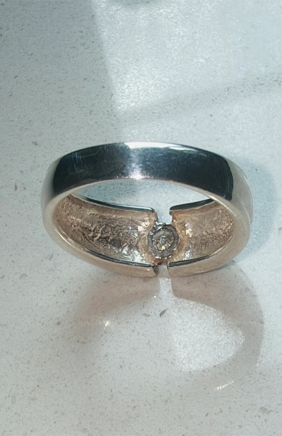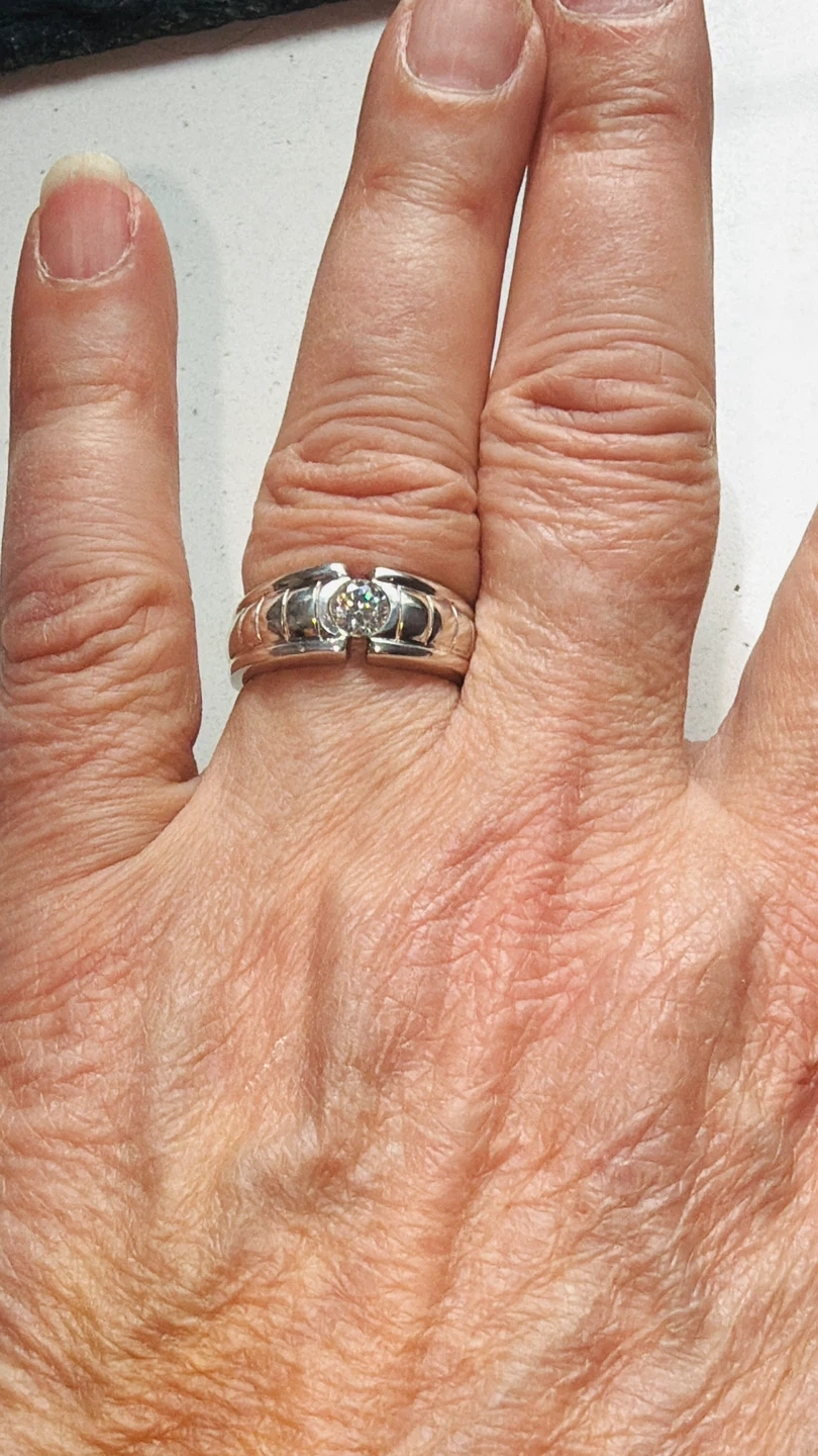 This is a stamped 925 sterling silver ring featuring a mid size Cubic Zirconia . The band has a grooved design. This ring would make a nice anniversary band.