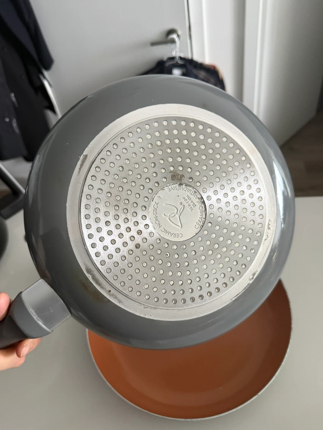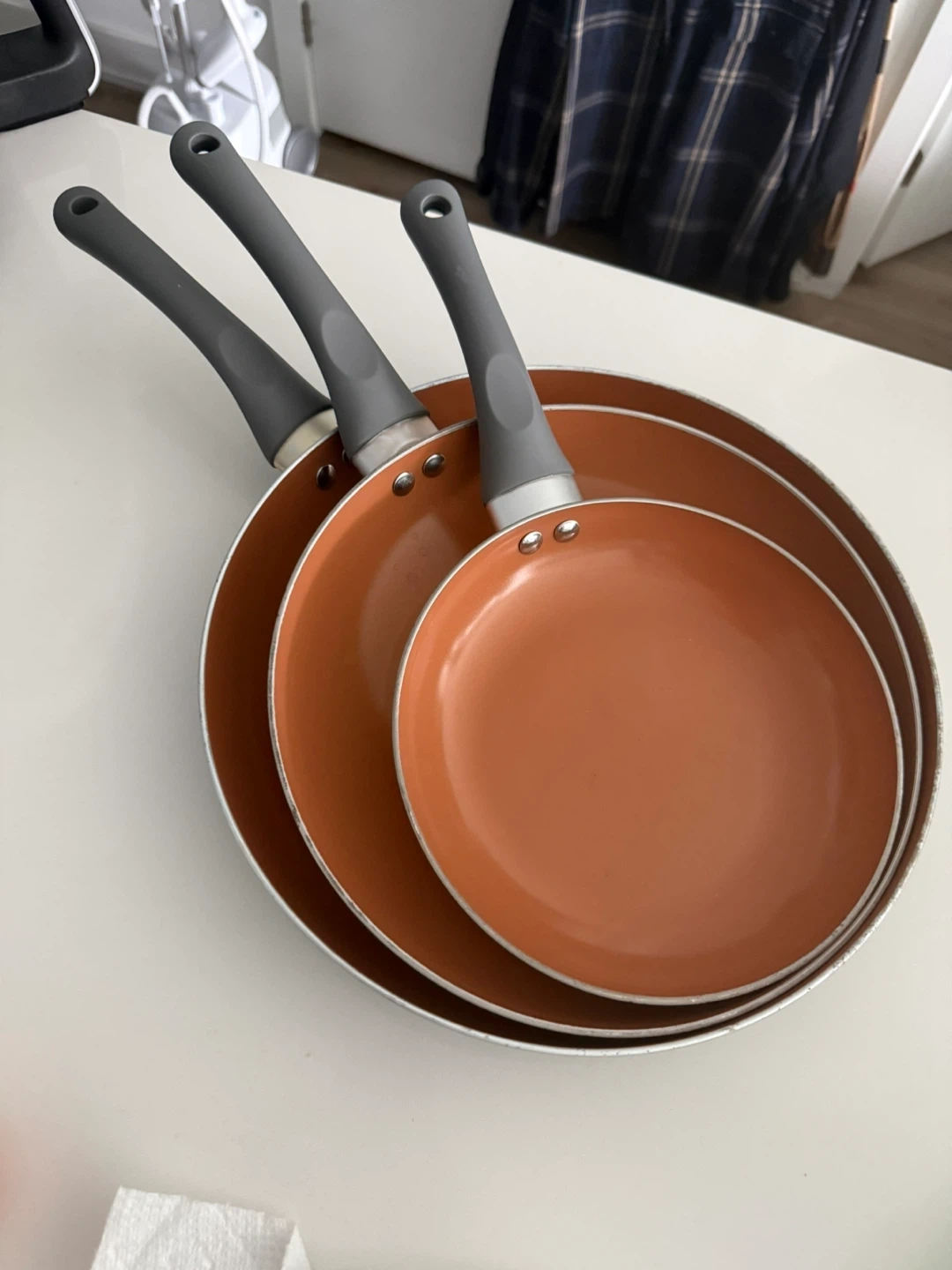 Set of three copper-coloured ceramic nonstick frying pans. Features comfortable grey handles and induction bottoms. Great for everyday cooking!