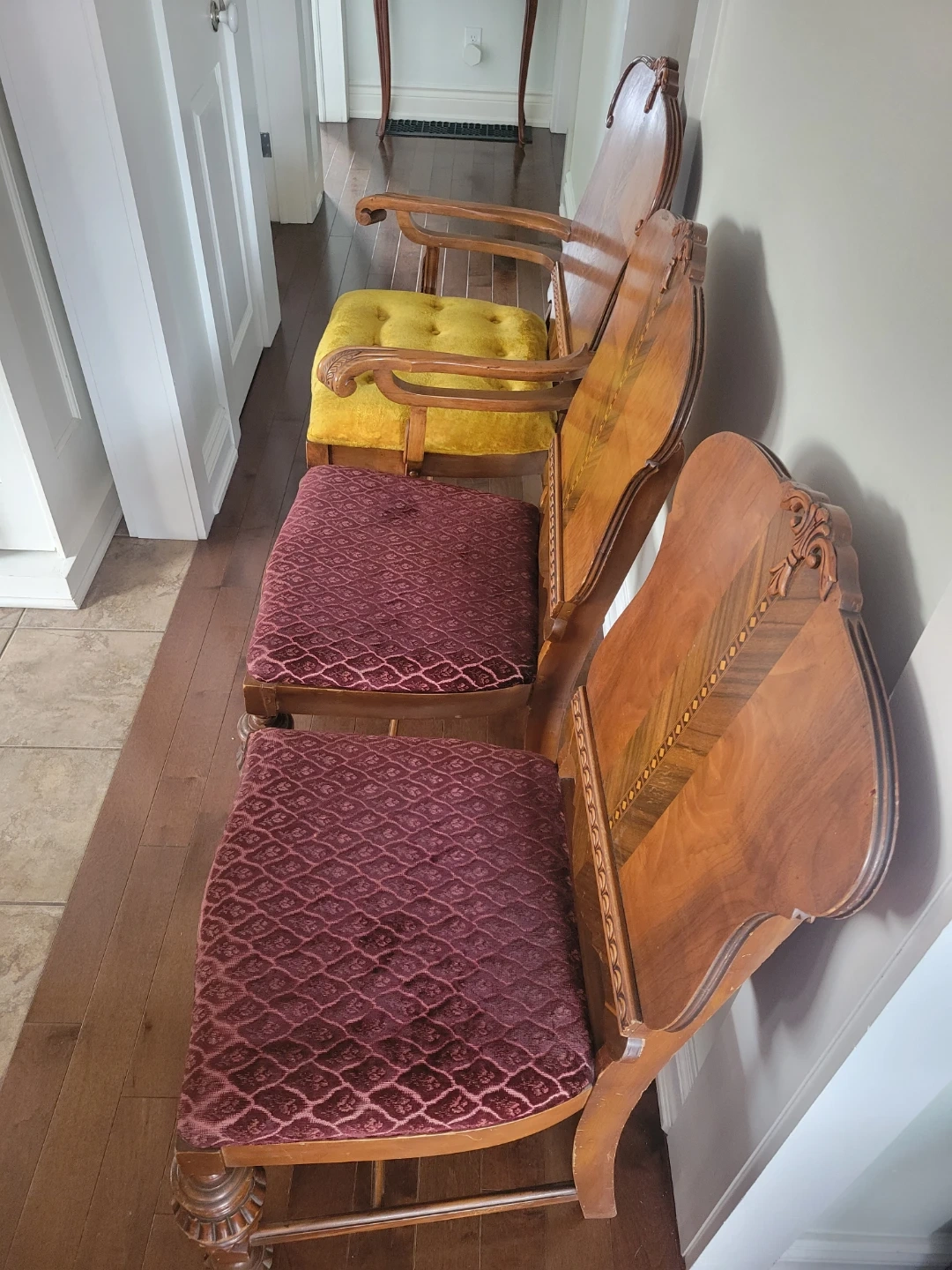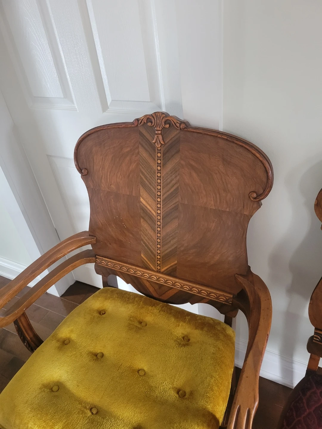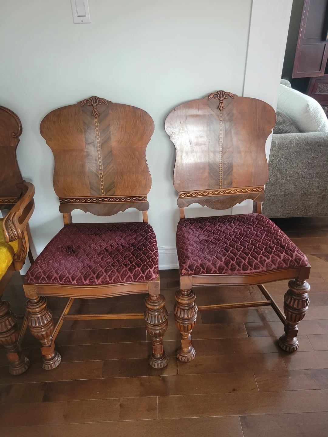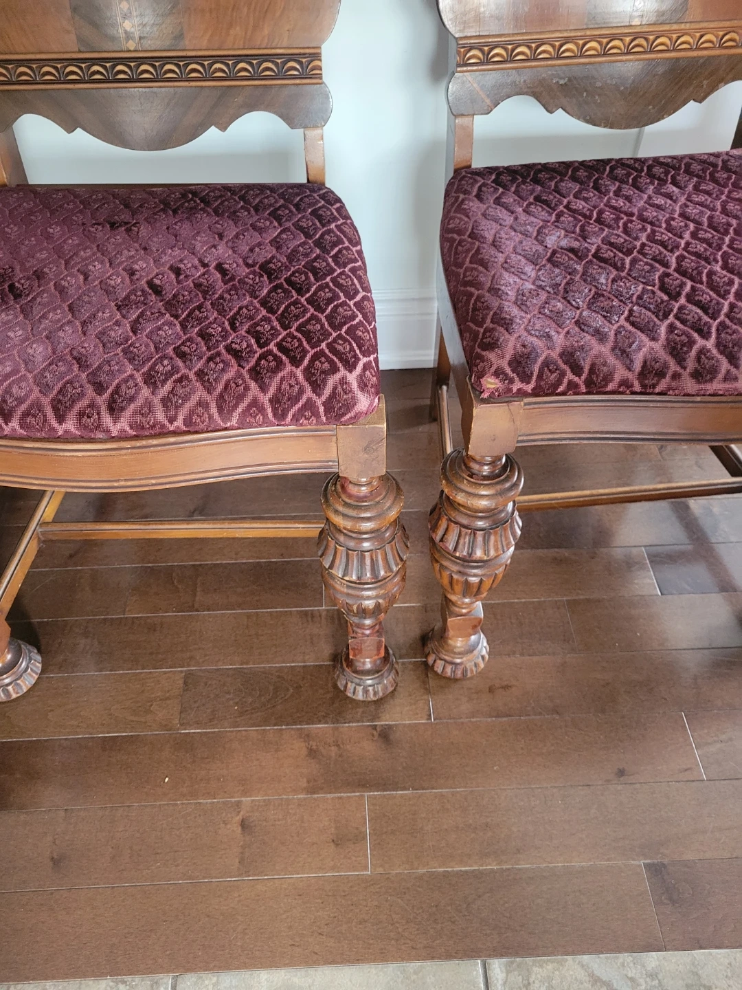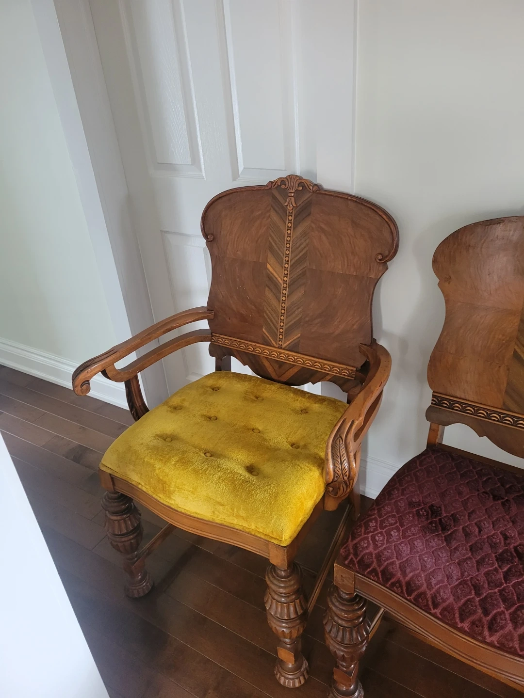 I'm selling a set of two used antique ornate wood chairs, perfect for adding a touch of vintage charm to any room. These chairs feature unique wood carvings and a distinctive design. While they show signs of wear consistent with their age, they remain sturdy and beautiful. The seat is upholstered with an eye-catching and decorative fabric. Perfect for a dining room or as accent pieces in your living space.