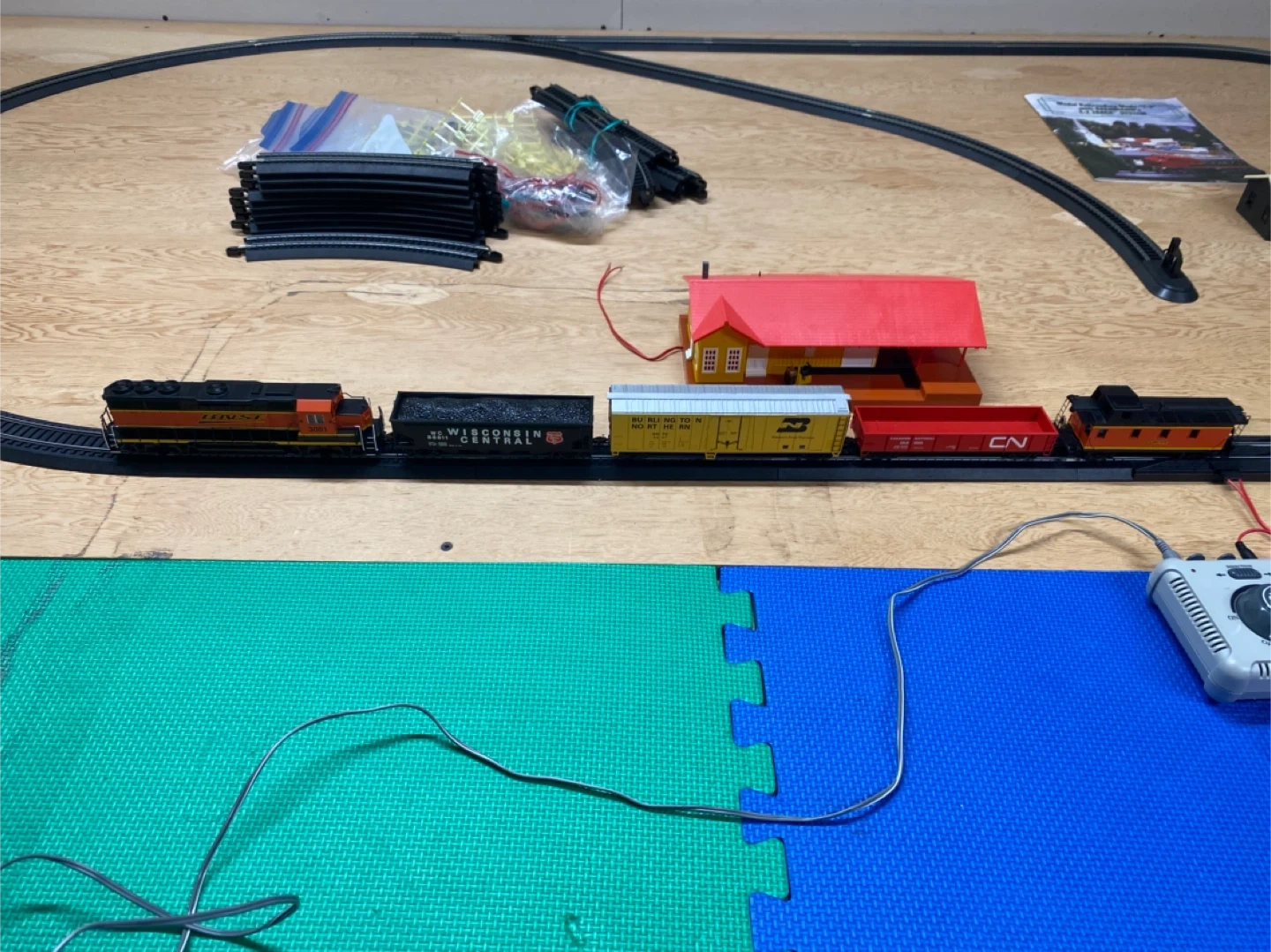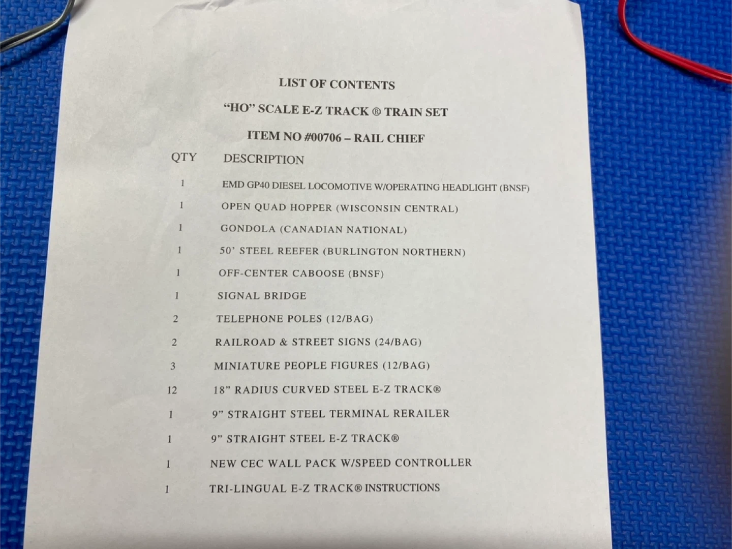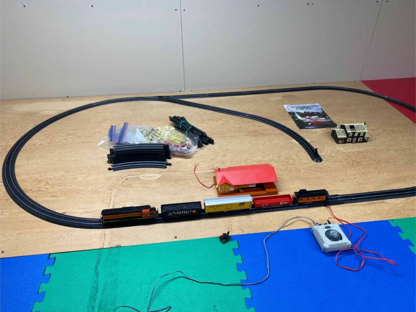60Selling an "HO" Scale E-Z Track Rail Chief Train Set. The item number is #00706. The set includes: - EMD GP40 Diesel Locomotive with operating headlight (BNSF) - Open Quad Hopper (Wisconsin Central) - Gondola (Canadian National) - 50' Steel Reefer (Burlington Northern) - Off-Center Caboose (BNSF) - Signal Bridge - Telephone Poles (12/Bag) - Railroad & Street Signs (24/Bag) - Miniature People Figures (12/Bag) - 18" Radius Curved Steel E-Z Track - 9" Straight Steel Terminal Rerailer - 9" Straight Steel E-Z Track - New CEC Wall Pack w/Speed Controller - Tri-Lingual E-Z Track Instructions