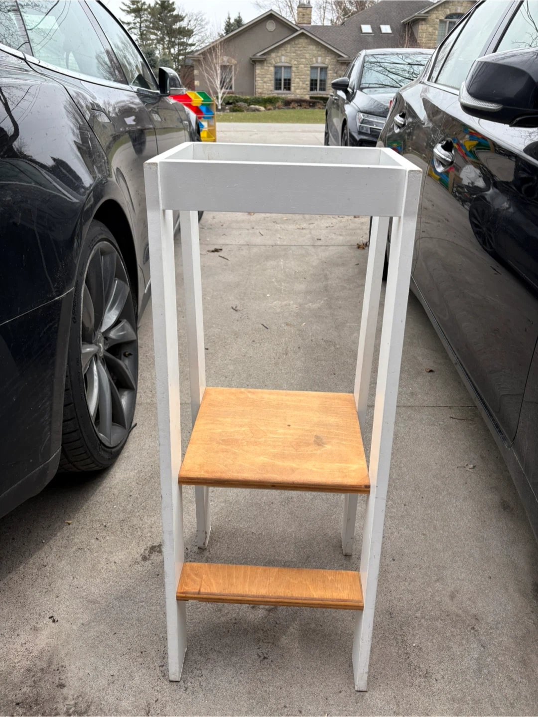 A sturdy wooden step stool with two tiers. The frame is painted white and the steps are natural wood. It's a handy helper for kids in the kitchen. Great for little ones to reach counters or sinks!
