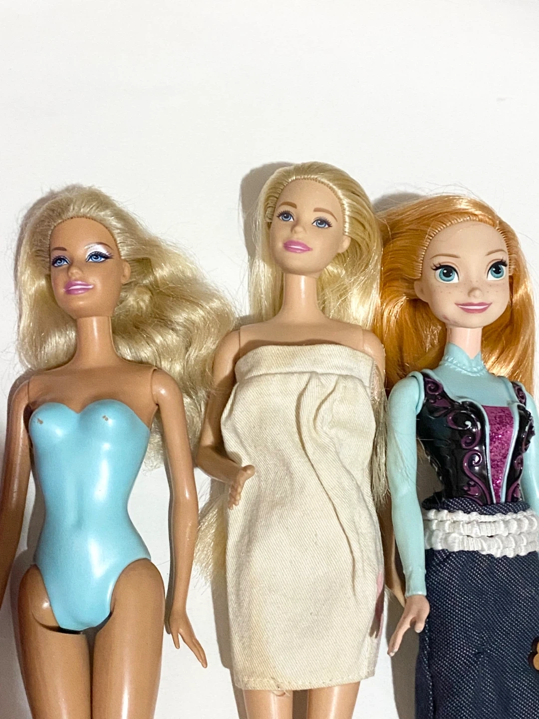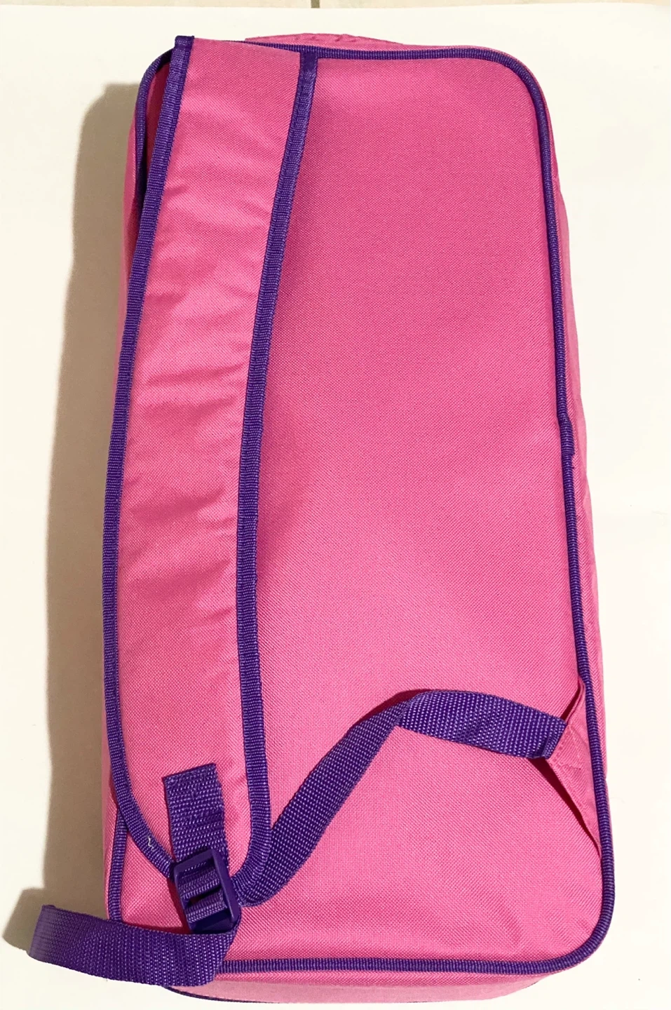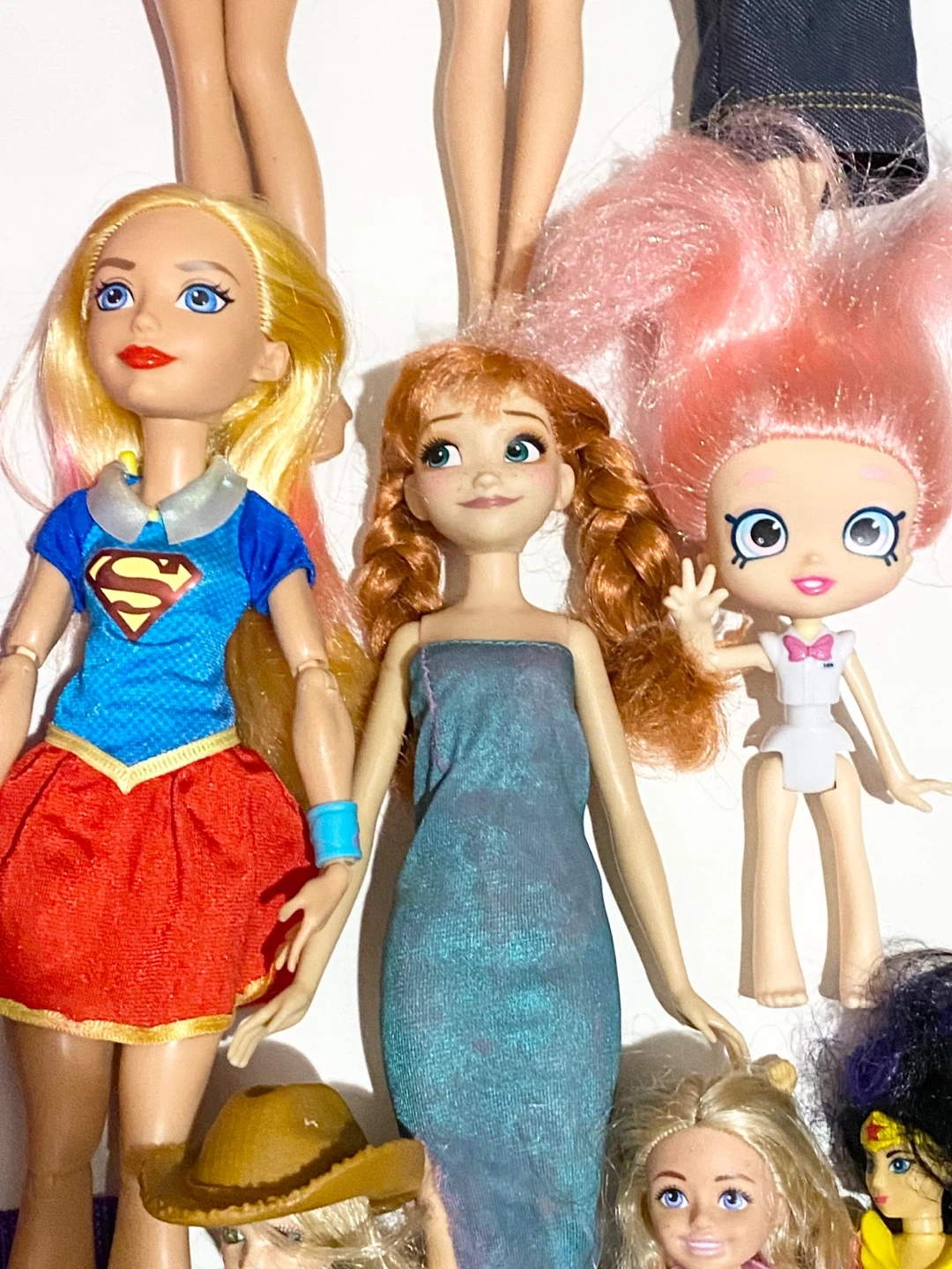 This lot includes a variety of dolls, some with distinct outfits like Supergirl and what appears to be a Disney character. A colourful carrying case with a patterned design and a mesh pocket is also included, along with a bag of doll accessories. The case has a handle for easy transport and measures 10”x 20”.