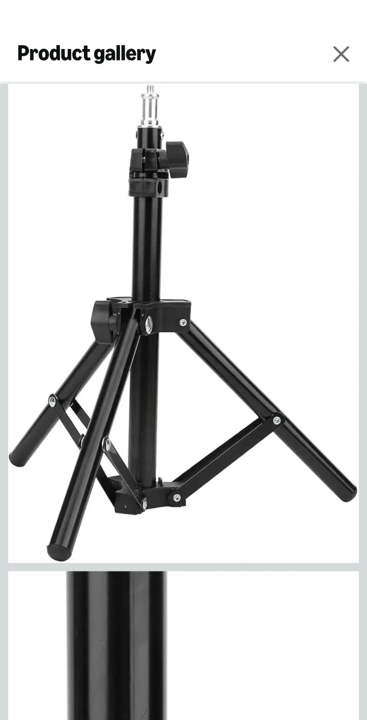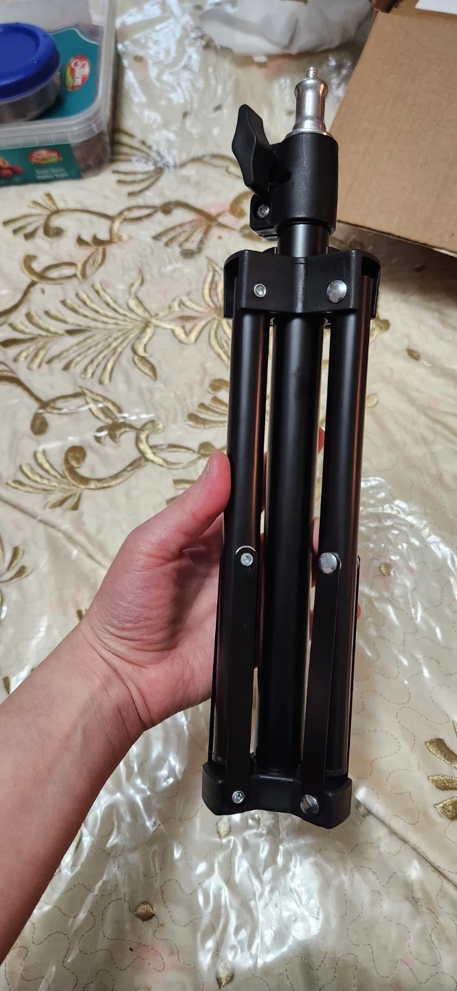 This is a black photography light stand with a tripod base. It's made of metal and folds down for storage. This stand is useful for supporting lighting equipment during shoots.
