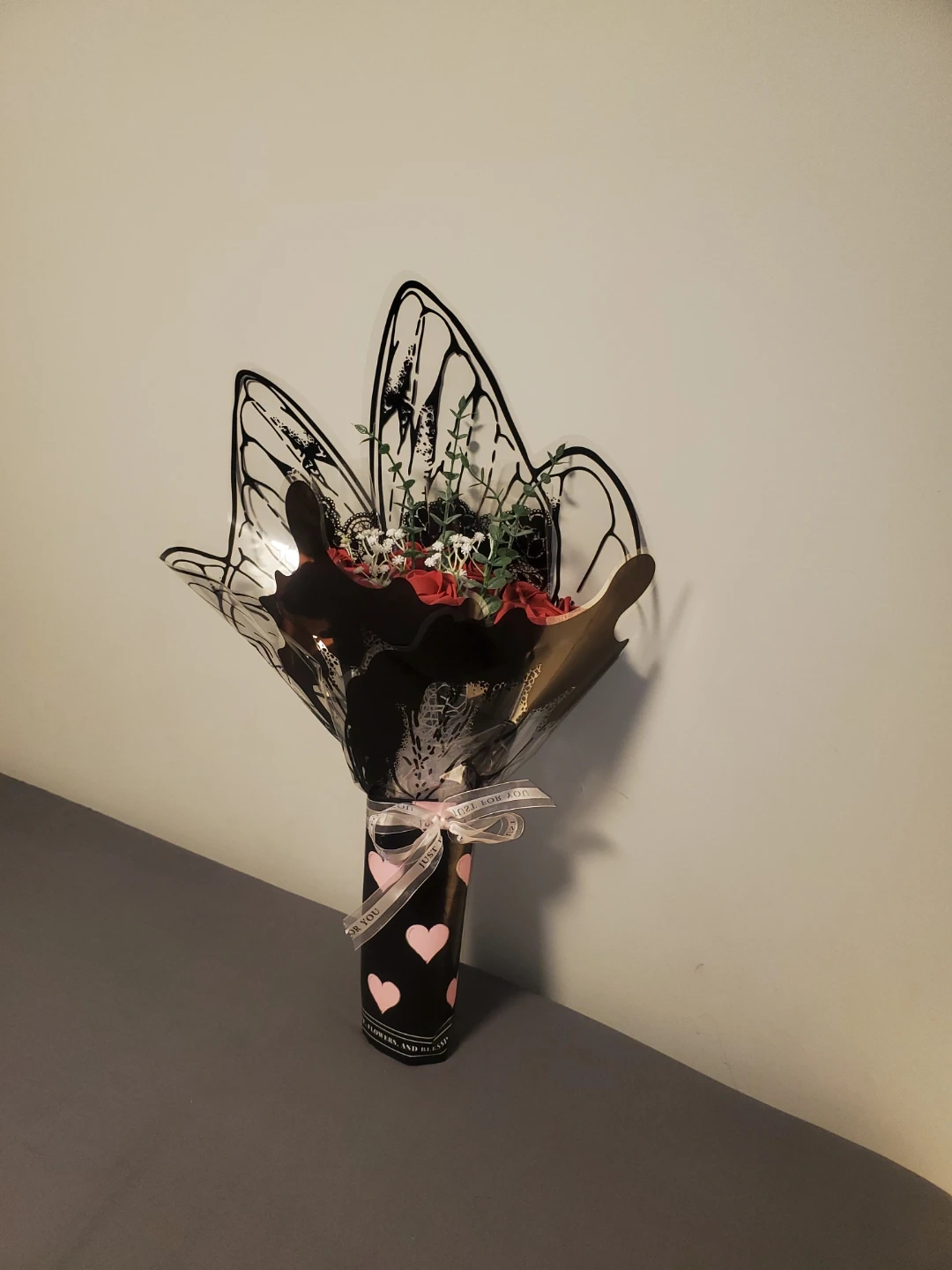 A beautiful butterfly bouquet, perfect for your Valentine, and adding a touch of elegance to any space! The arrangement features lovely roses and greenery, wrapped in a stylish black paper with pink heart accents and a delicate ribbon