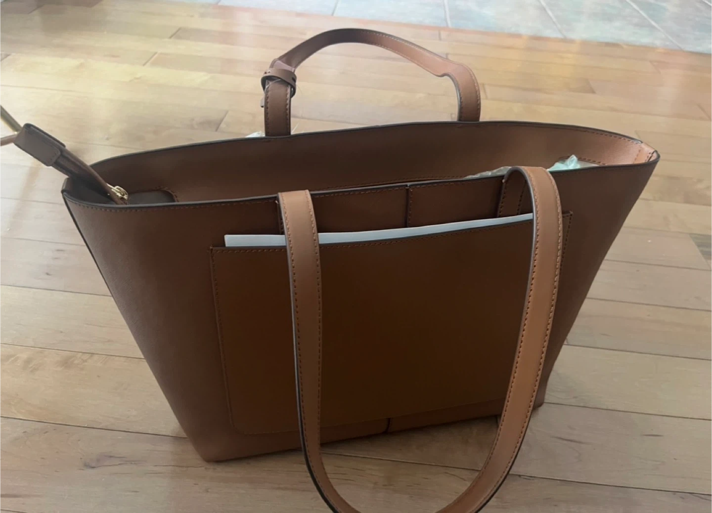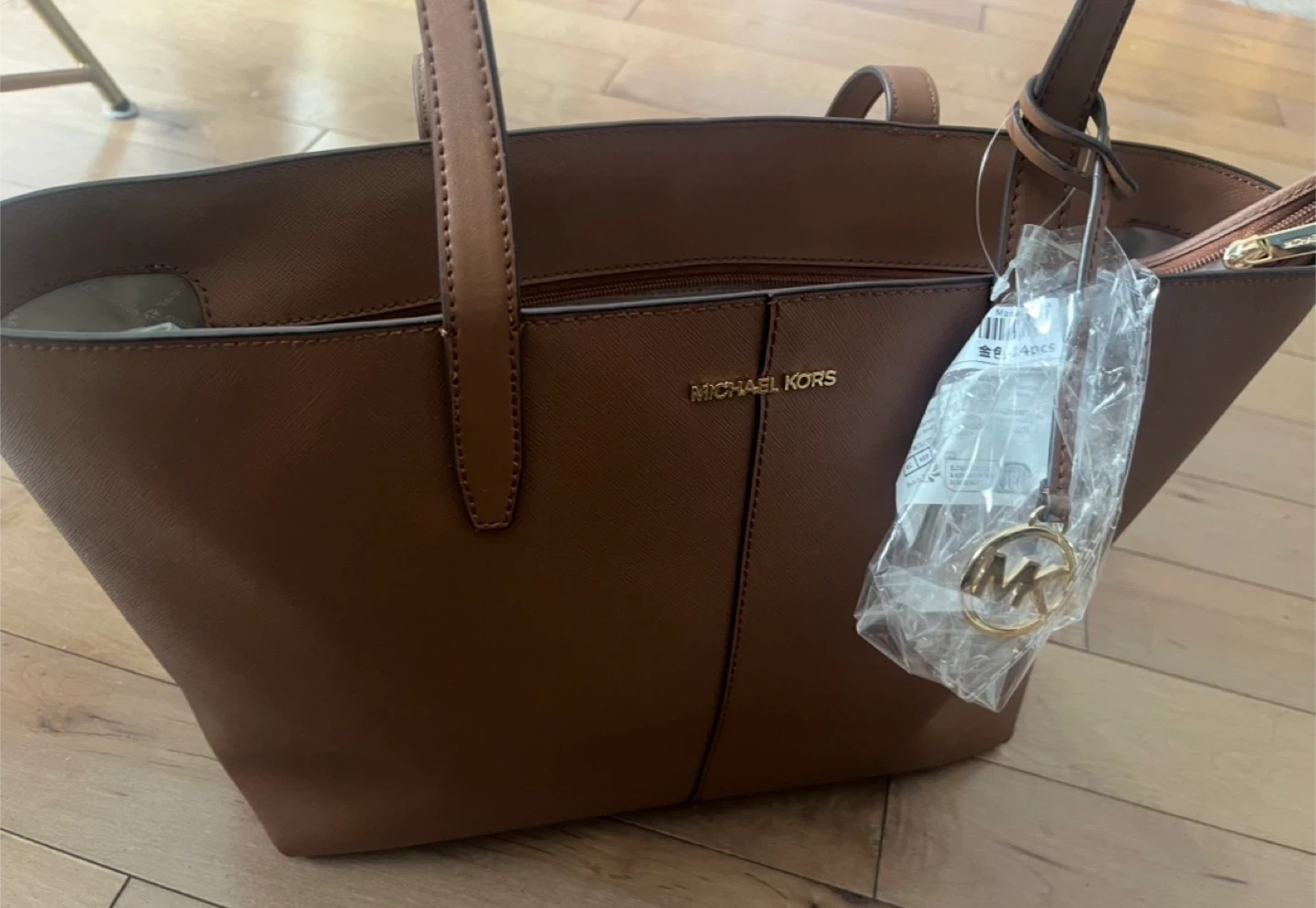 It's a brown Michael Kors tote bag. The material is cross-grain leather. This bag has a zip top closure and interior pockets. It's great for everyday use!