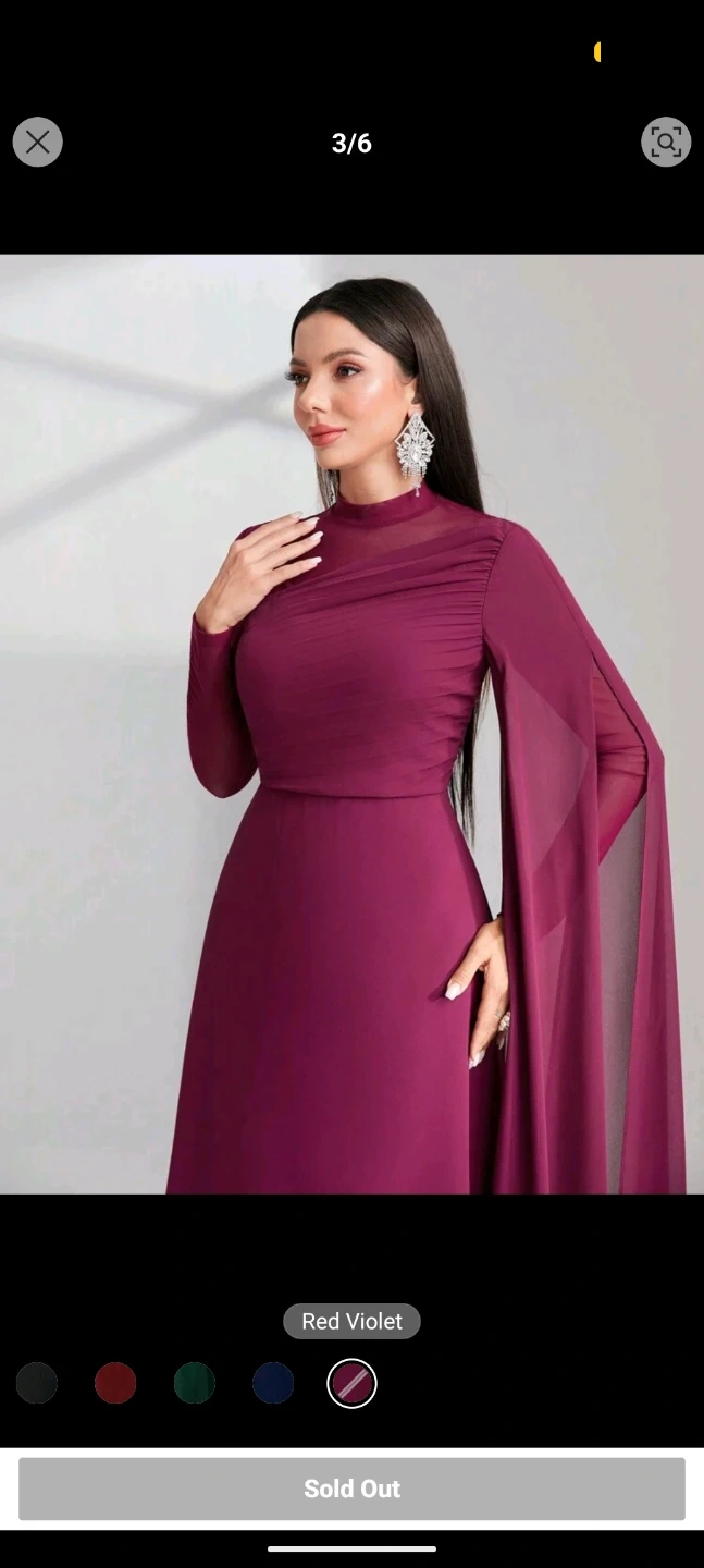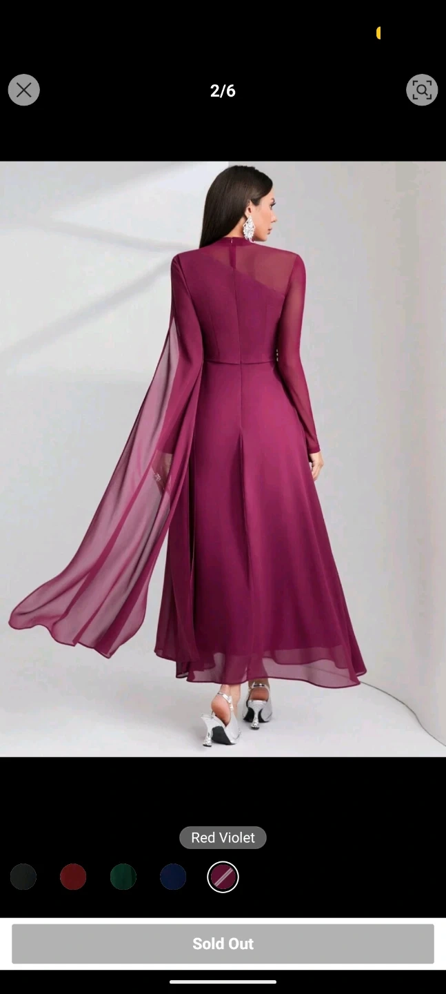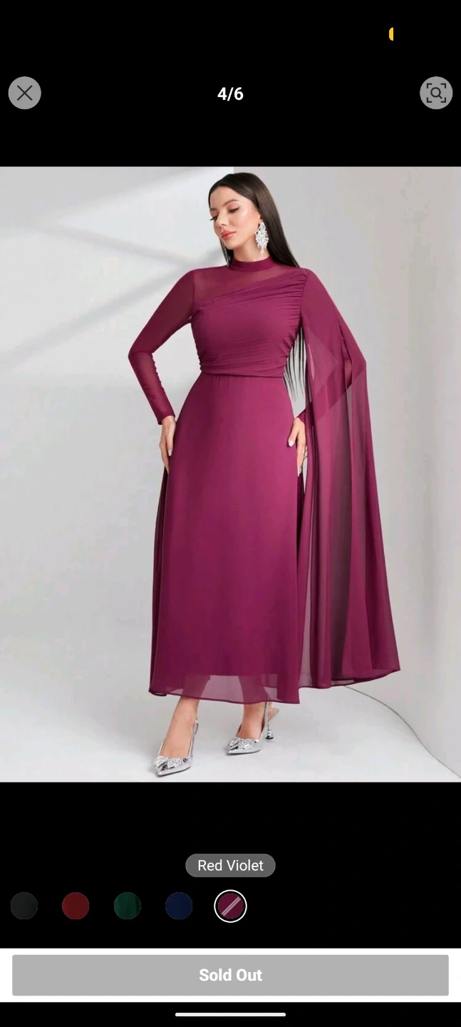 Elegant long-sleeved dress in a deep red violet hue. Features a mock neck and flowy chiffon cape detail. Perfect for special occasions!