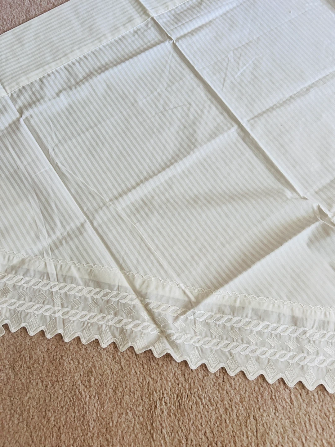 Each panel measures 48 inches wide by 65 inches long at longest peak. The cotton lace along edges is about 5 inches wide