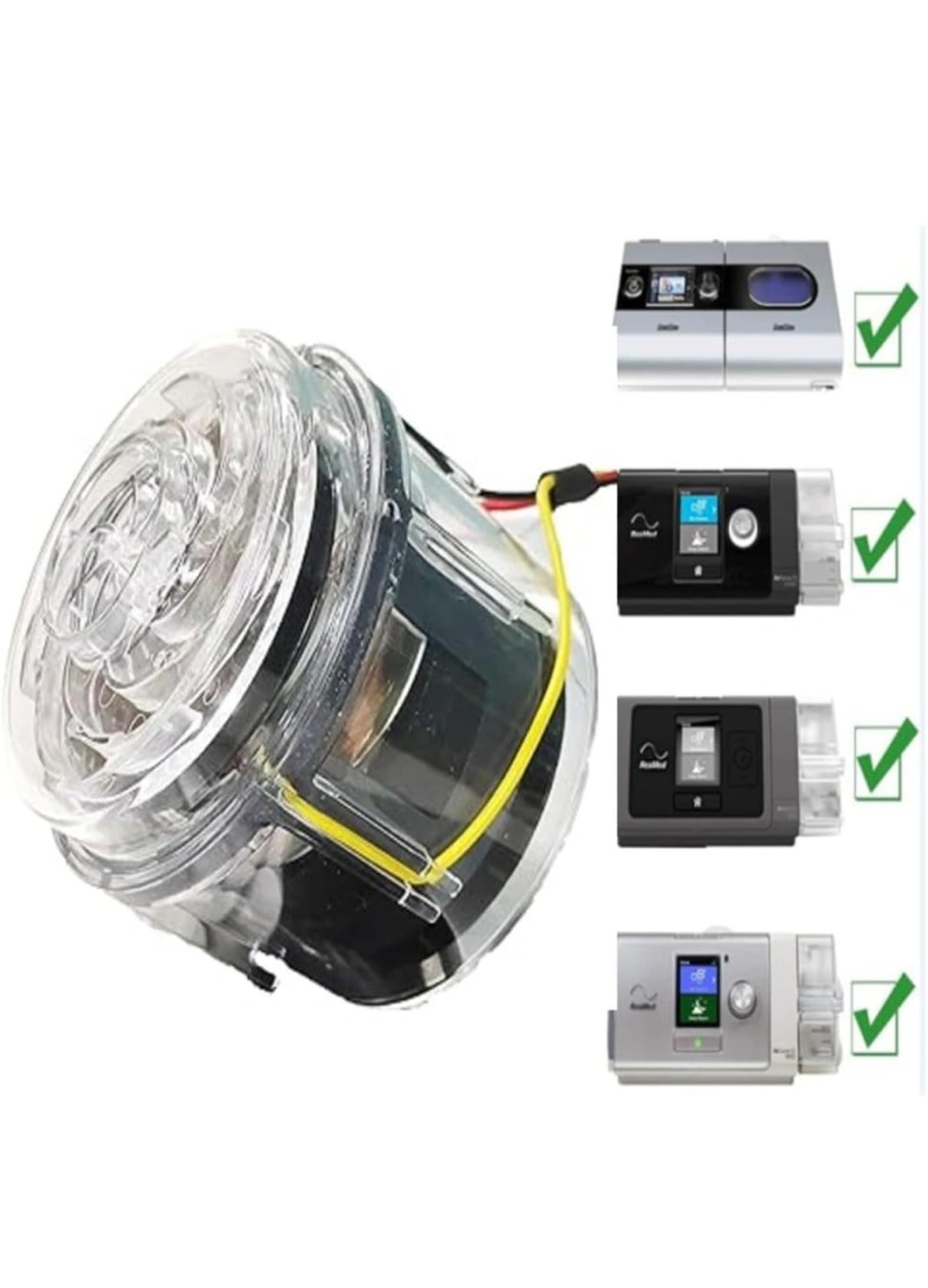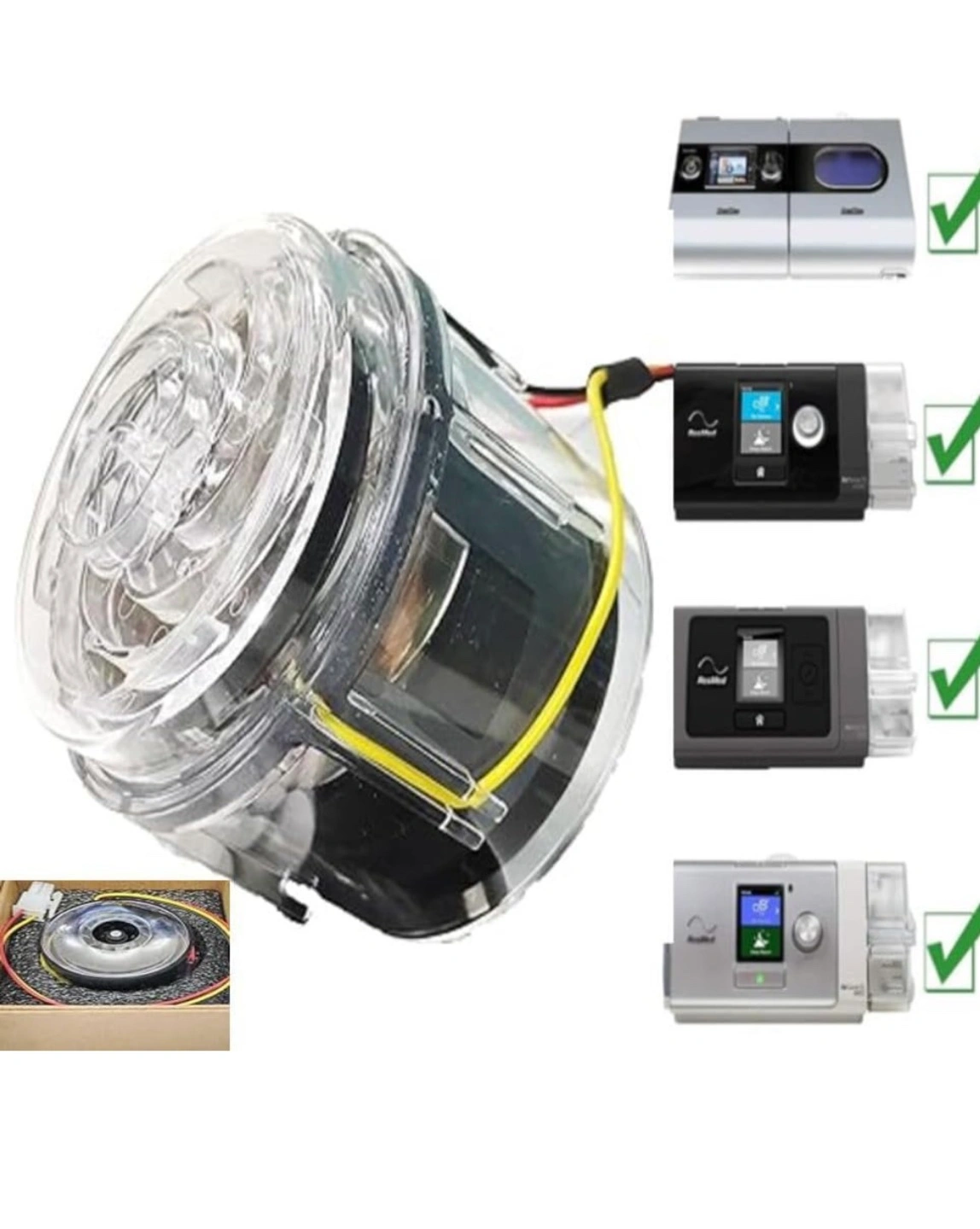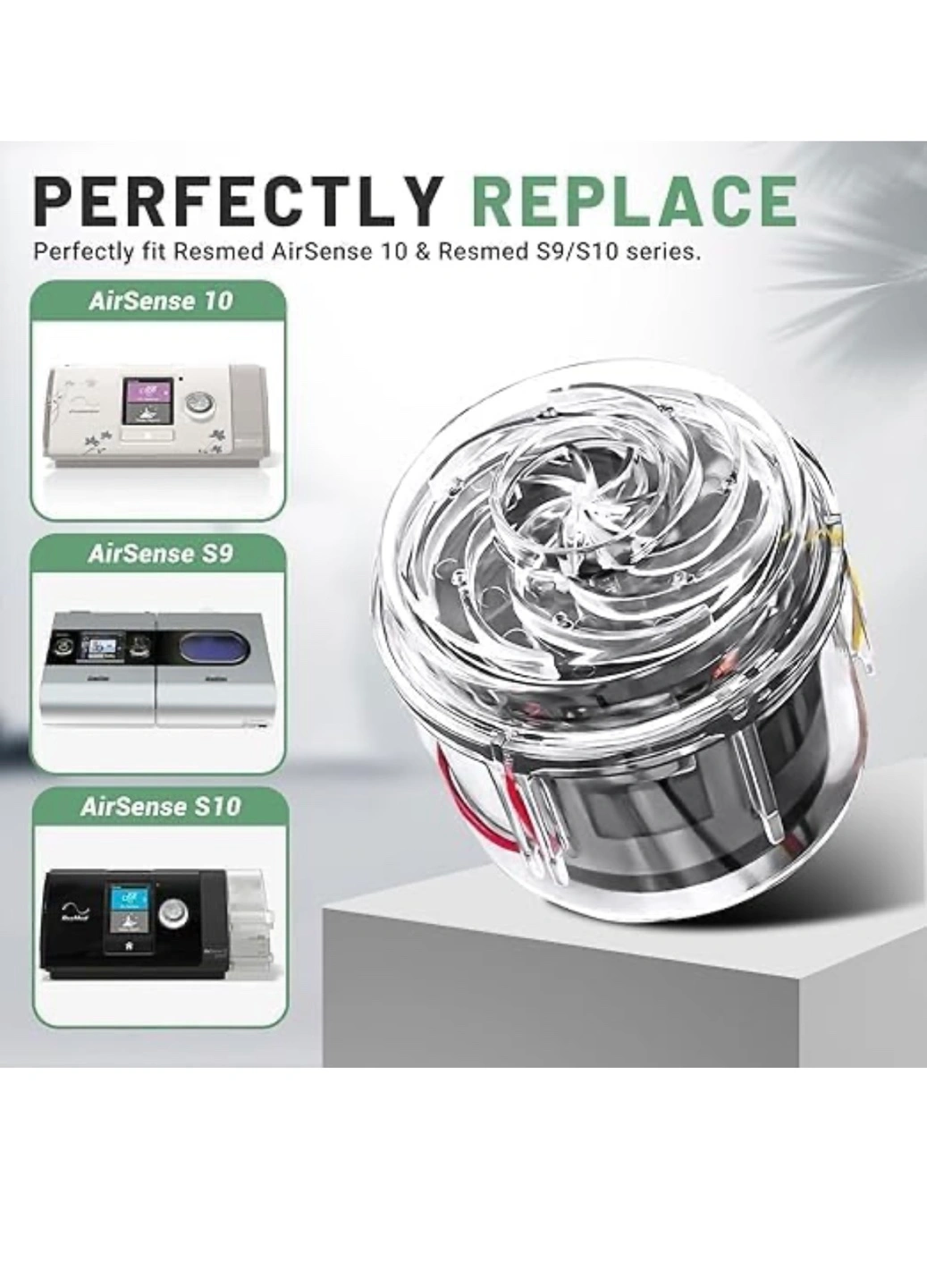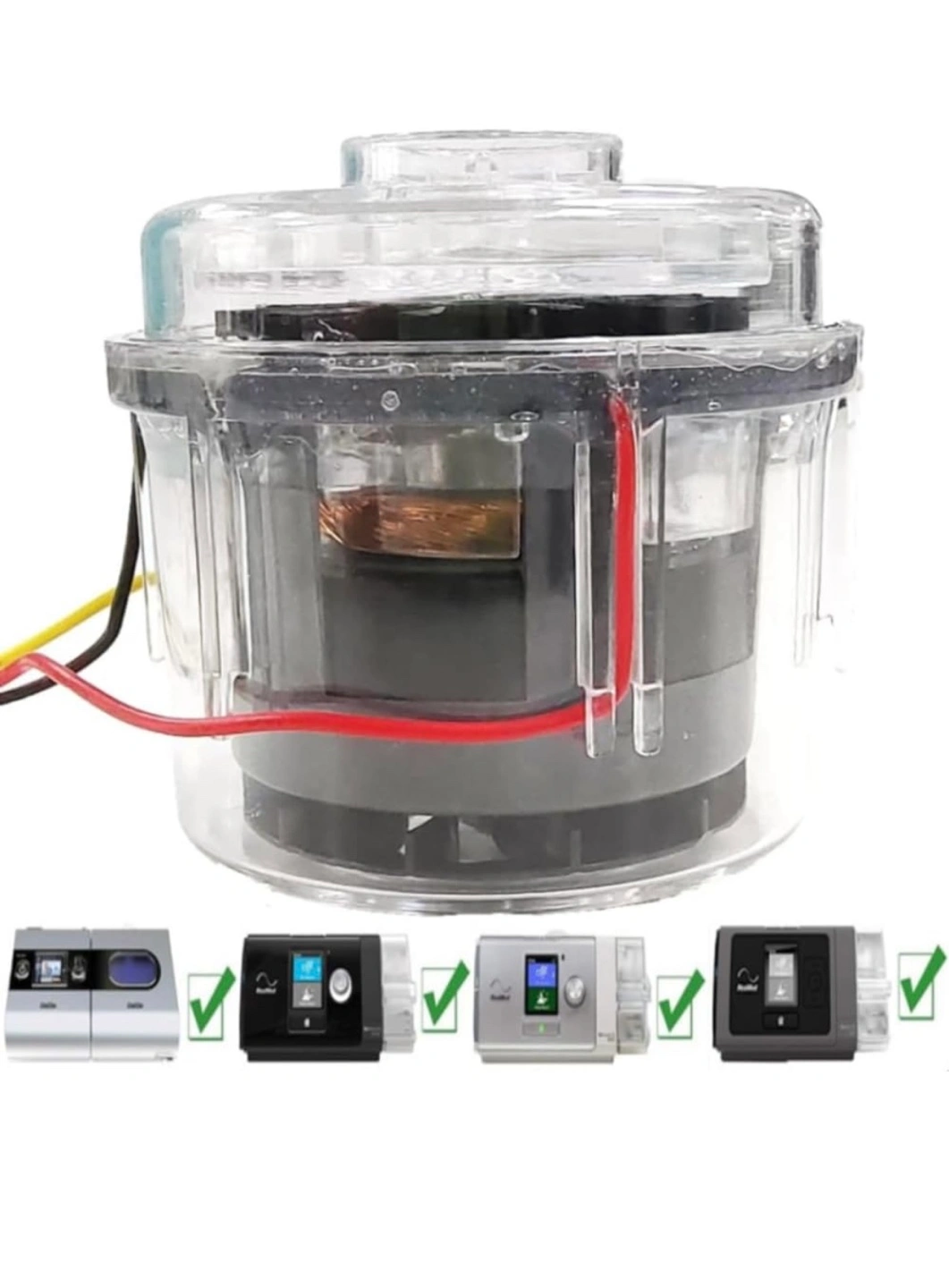 Replacement fan motor. Compatible with AirSense 10, AirSense S9, AirSense S10 and ResMed S9/S10 series CPAP machines. Clear plastic housing. Includes wiring.