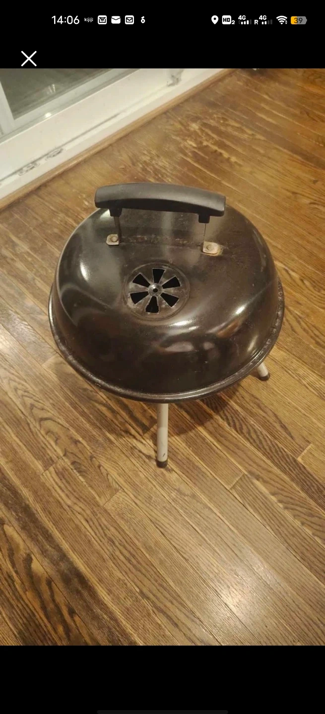 Selling a portable charcoal grill, perfect for small spaces or taking on the go! It's in used condition but still has plenty of life left. It has a black lid and three legs.
