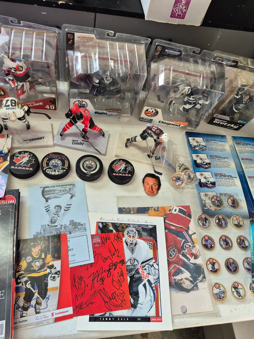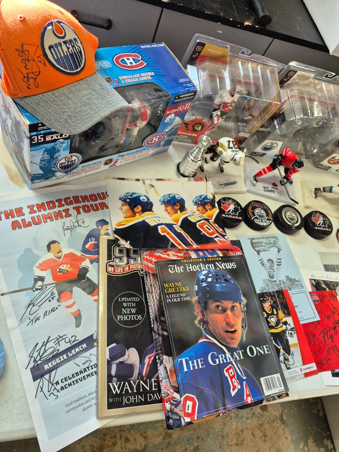 75Selling a collection of hockey memorabilia! Includes figures, pucks, signed photos, and more featuring the Oilers, Wayne Gretzky, and Sidney Crosby. Great for any hockey fan or collector